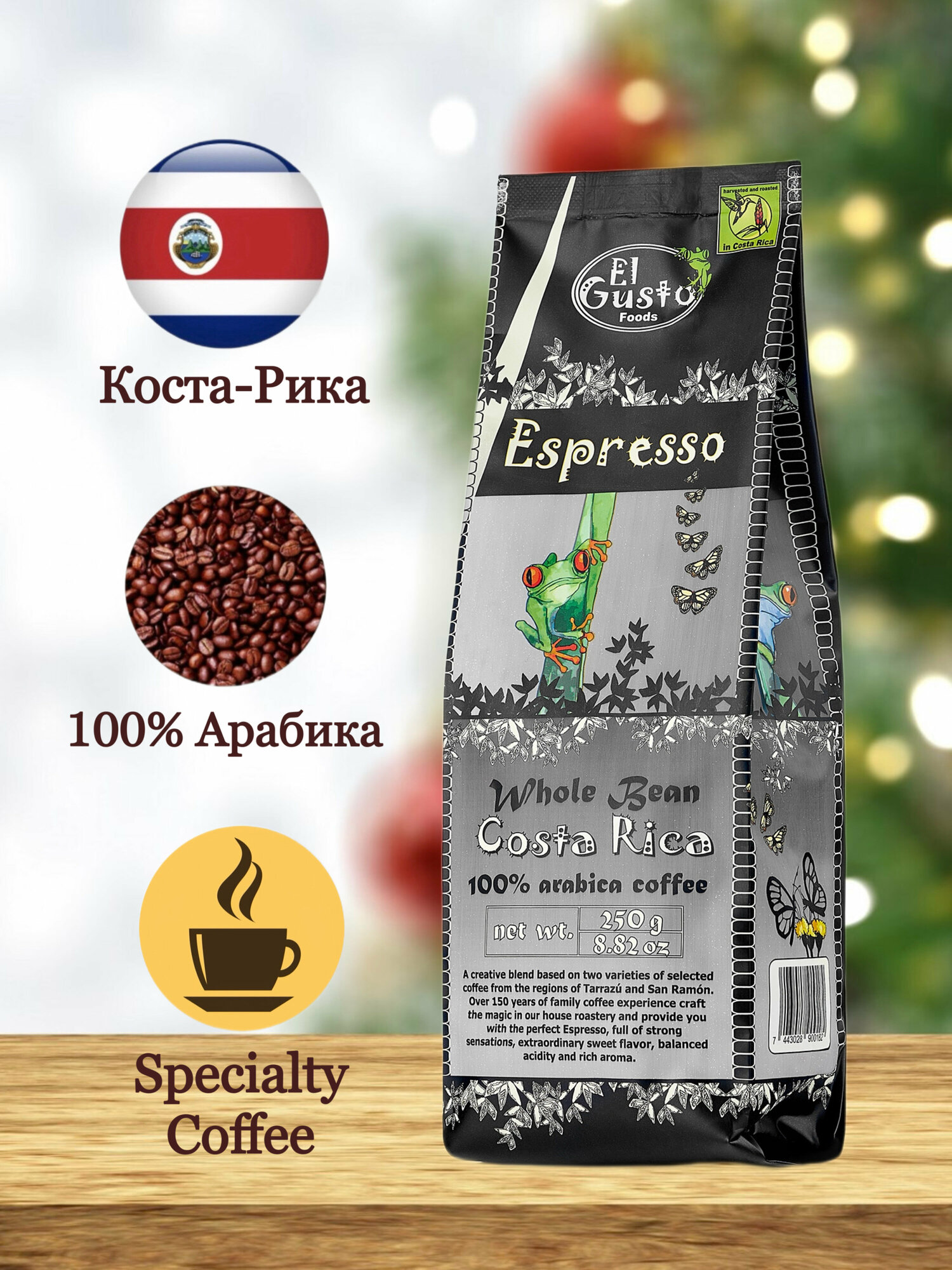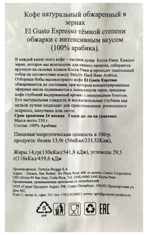 El Gusto Espresso тёмной степени обжарки с интенсивным вкусом100% арабика.В каждой капле этого кофе частица души Коста Рики. Каждое зерно, которое мы используемдля нашего напитка, собирается вручную на склонах холмов Коста Рики и проходит тщательныйотбор на соответствие классу Strictly Hard Bean Arabica. Отборные бобы высокогорного кофе E.Gusto Espresso обжариваются до состояния, при котором концентрированные эфирные маслаподнимаются к поверхности зерна, придавая кофе глубокий выдержанный аромат с незауряднымбукетом. Его натуральная сладость и восхитительная глубина как нельзя лучше подходятдля приготовления роскошного эспрессо, капучино или латте.