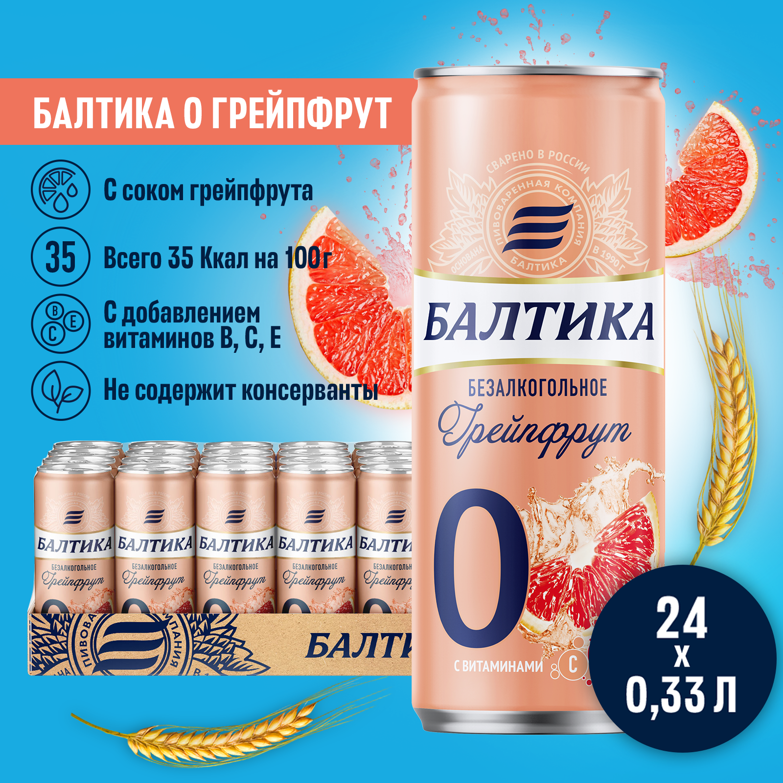 Балтика 0 Грейпфрут это освежающий безалкогольный напиток с добавлением сока грейпфрута. Обладает сбалансированным в меру сладким вкусом с бодрящей кислинкой сочного Грейпфрута.