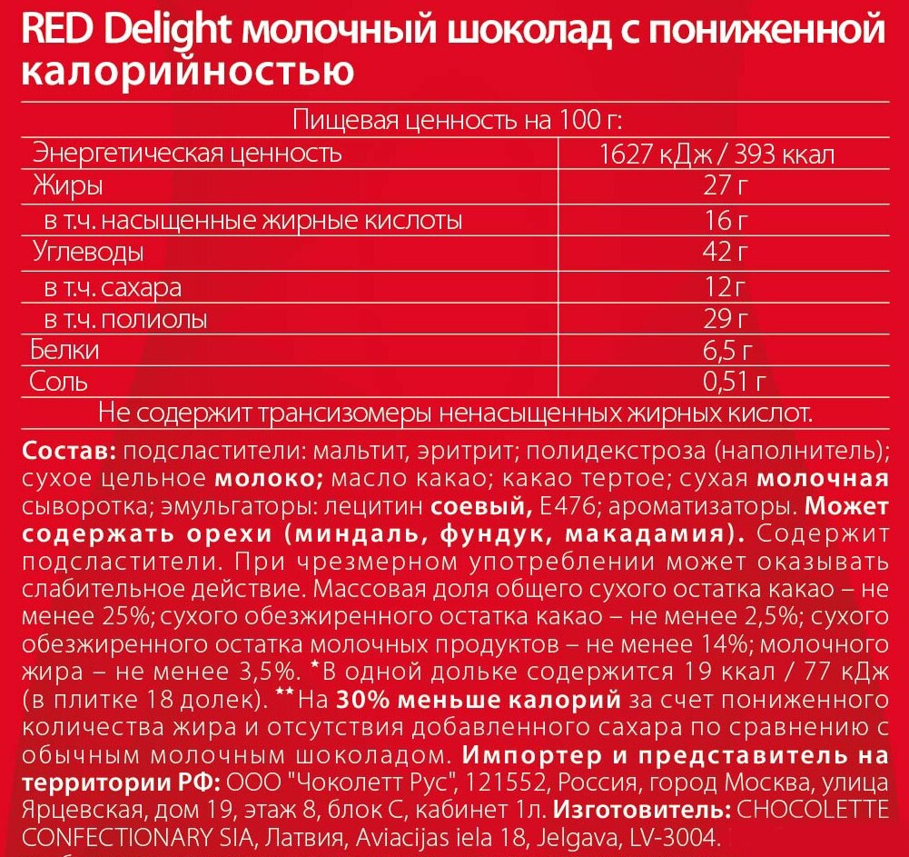 Изготовлен в Европе: шоколад RED изготавливает швейцарская компания Chocolette Confectionary на своей новой фабрике в Латвии. Качество шоколада гарантировано сертификатом BRC, признанным в 30 странах мира.