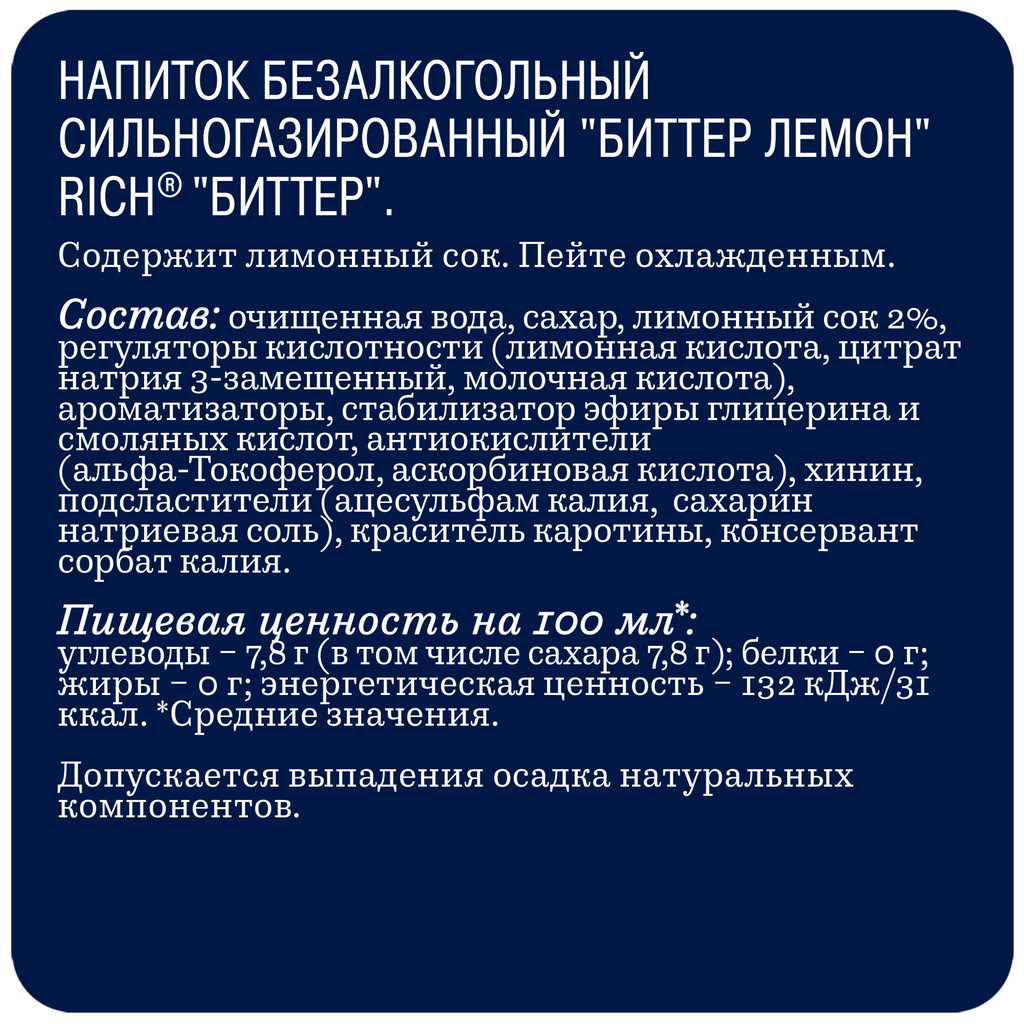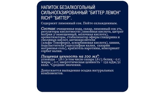 Rich Tonic&Bitter - это сильногразированные напитки высокого качества с особенным вкусом для настоящих ценителей. Rich Биттер Лемон это классическое сочетание горьковатого вкуса тоника с нотами лимона. Отлично подойдет как самостоятельный напиток, так и в качестве ингредиента для коктейлей.