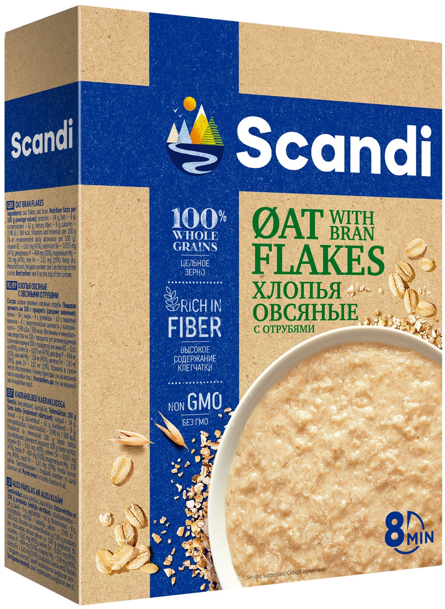 Хлопья овсяные SCANDI с отрубями приготовлены по традиционной финской технологии, соответствующий европейским нормам качества. Природа и климат северных широт, наполненные изумительным свежим воздухом и чистейшей водой, позаботились о созревании полезного зерна. Благодаря близости к полярному кругу и большому количеству длинных световых дней овес и другие зерновые культуры накапливают больше полезных веществ и микроэлементов. Современное европейское оборудование и финская технология бережной очистки зерновых культур и производства хлопьев позволяют сохранить все полезные свойства зерна, гарантируют легкость в приготовлении, а также обеспечивают нежный вкус приготовленной каши.