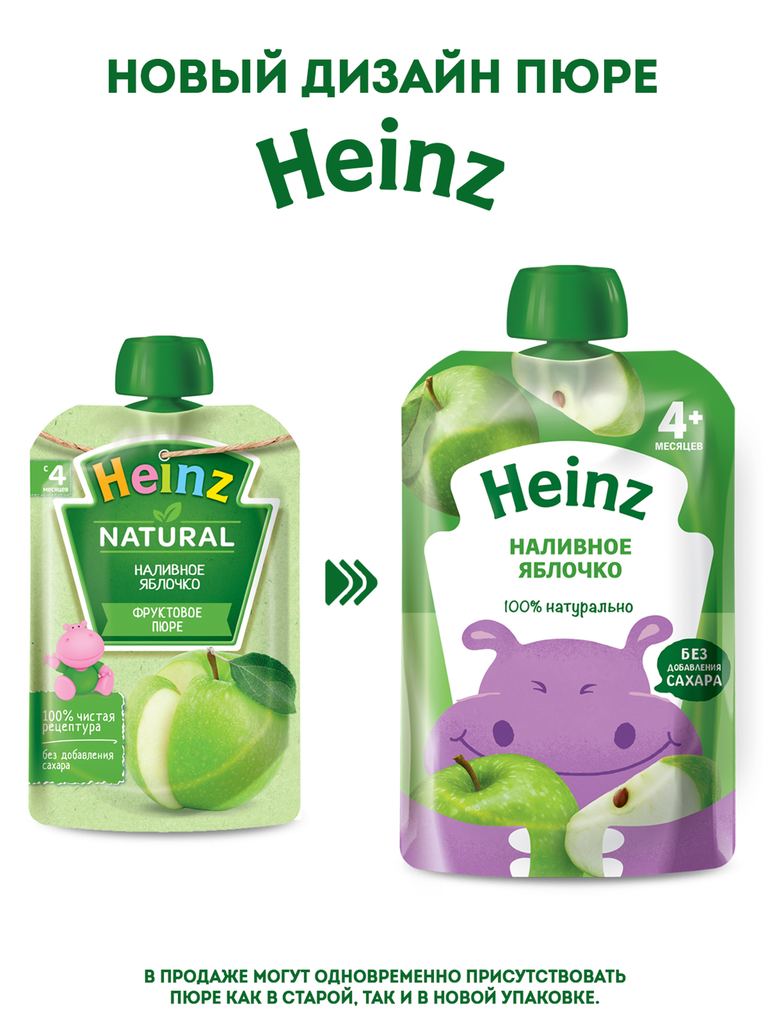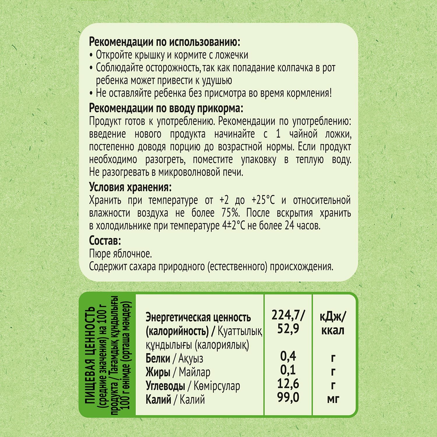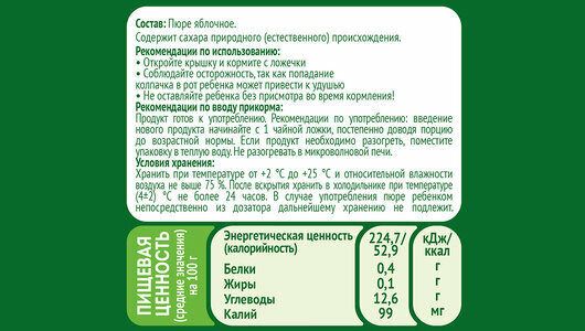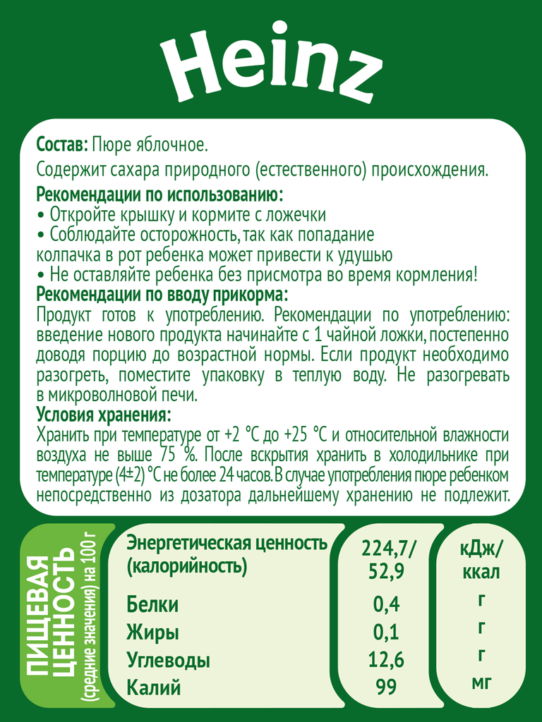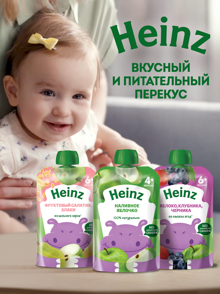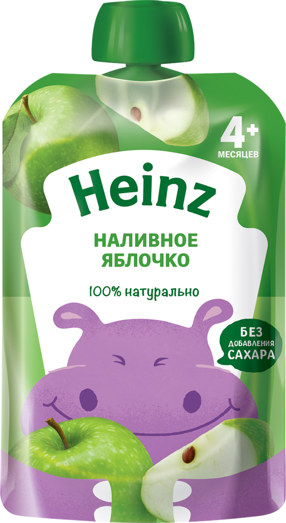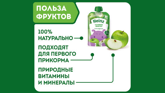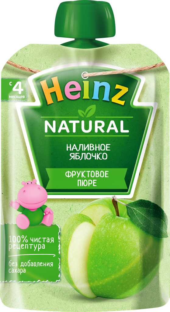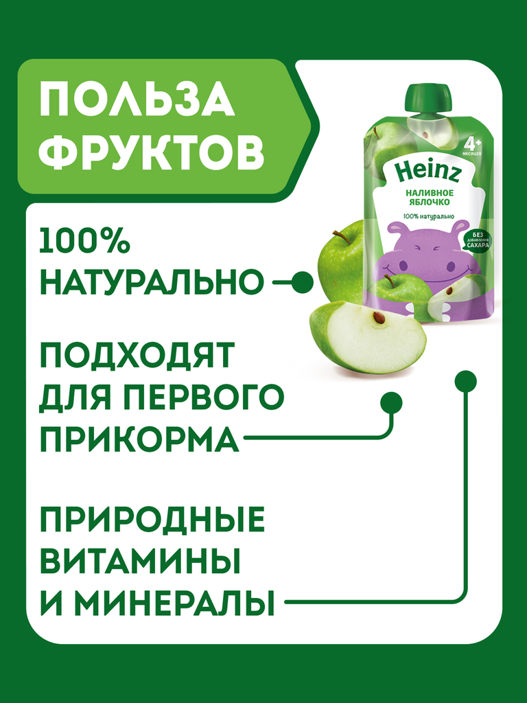 Готовое яблочное пюре Heinz в герметичной упаковке с крышечкой подходит для кормления малышей с 4 месяцев. Продукт можно давать ребенку в качестве полдника или полезного перекуса. Благодаря удобному формату упаковки пюре удобно брать с собой, например, на прогулку или в дорогу, а ребенок сможет есть пюре самостоятельно. Фруктовые пюре произведены только из натуральных ингредиентов и не содержат искусственных добавок. Яблоки - источник калия, магния, витаминов группы B, аскорбиновой кислотой и богаты пектином и растительной клетчаткой, поддерживающими работу кишечника. Для пюре отобраны сочные и спелые фрукты, которые позволят получить необходимые витамины и минералы. Природная польза фруктов для вашего ребенка. Детские яблочные пюре Heinz создаются с заботой о самых маленьких. 100% чистая рецептура. Только яблоко. Без добавления крахмала и сахара. Без консервантов, красителей, ароматизаторов и ГМО. Удобная мягкая упаковка Фруктовые пюре из яблок легко усваиваются, не нагружая желудочно-кишечный тракт ребенка. Продукция полностью готова к употреблению.