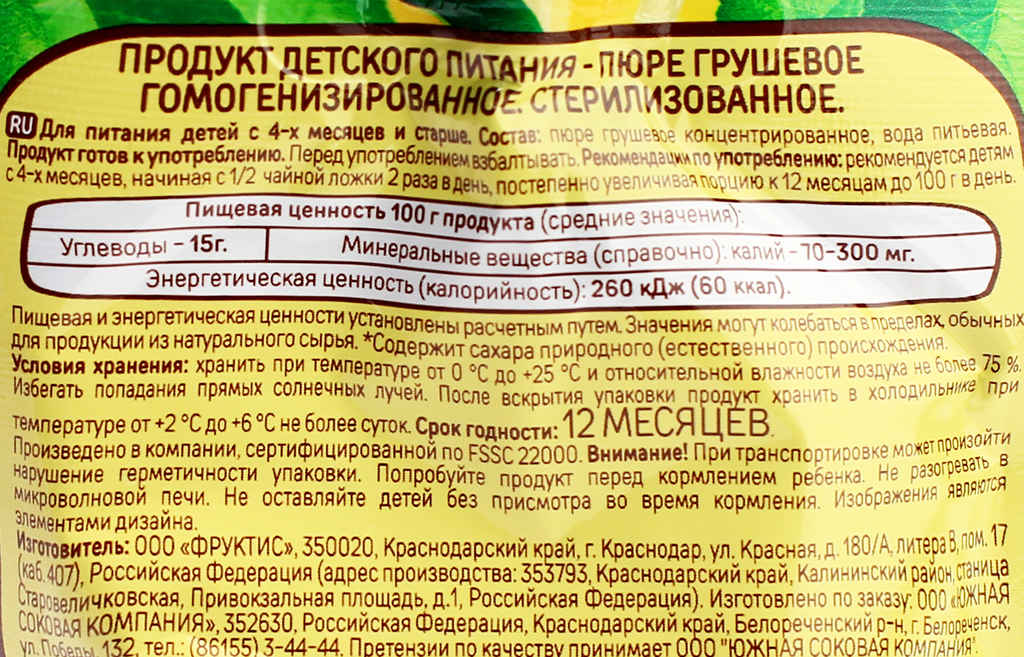 | Состав | грушевое пюре, вода питьевая |