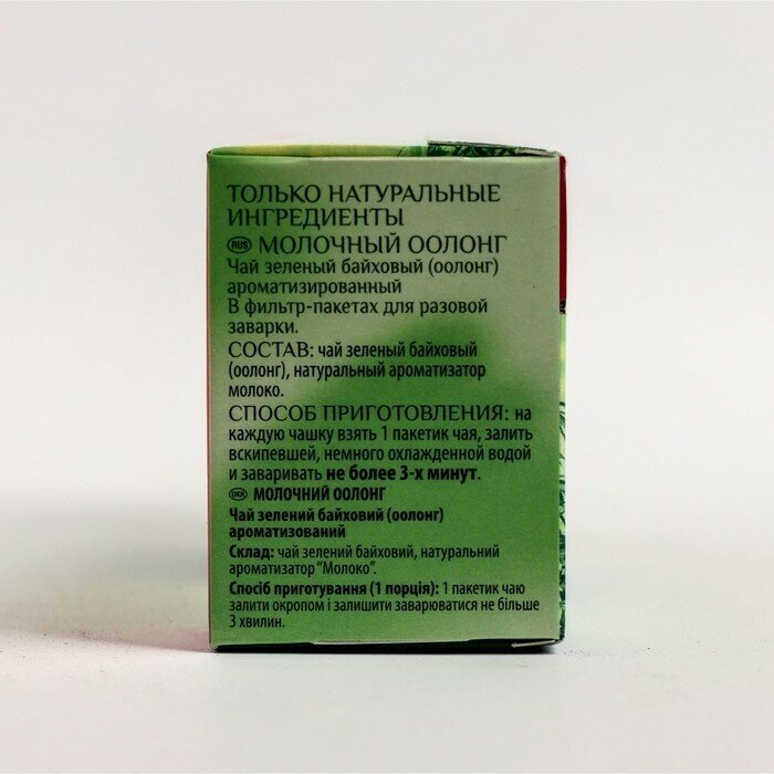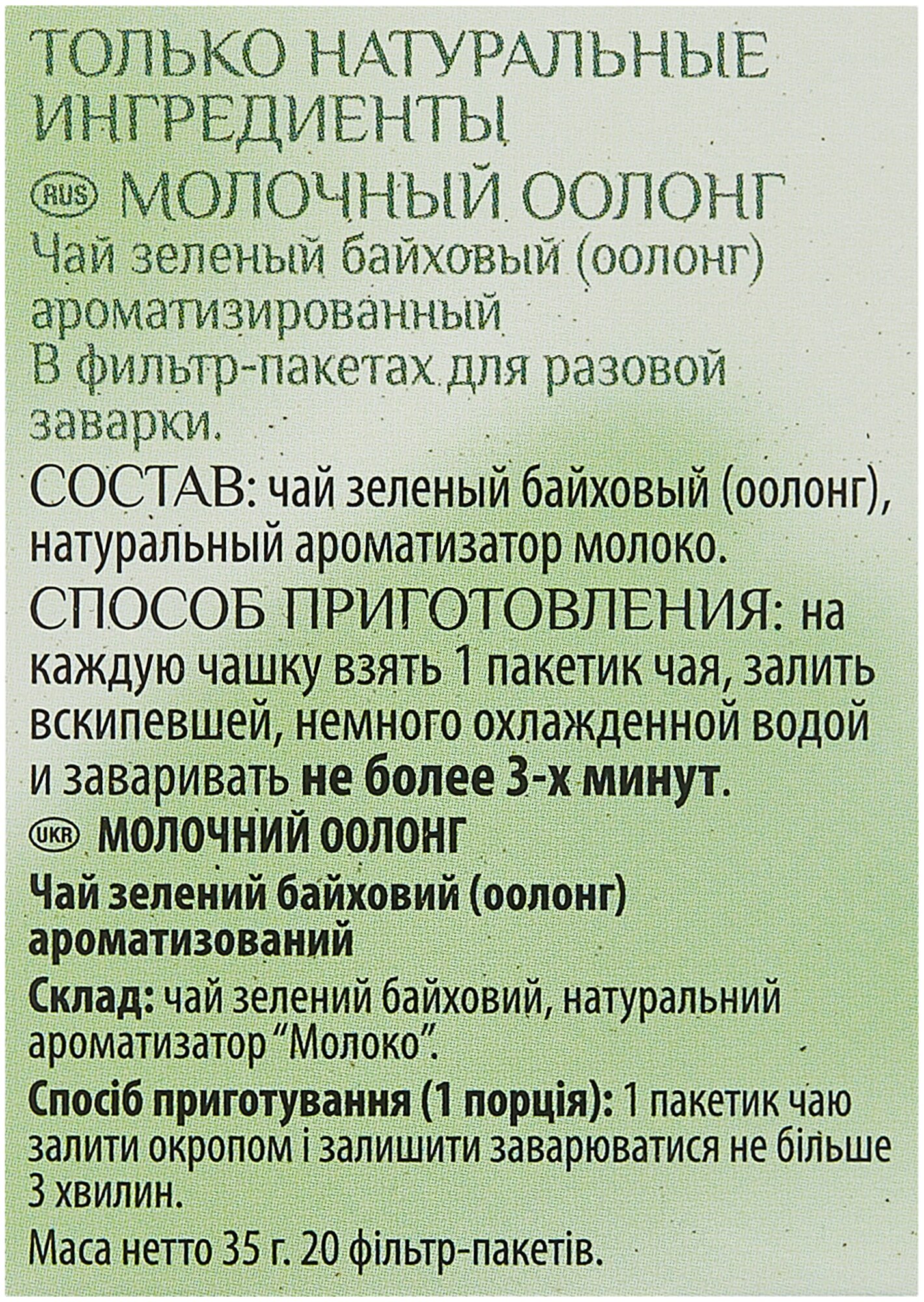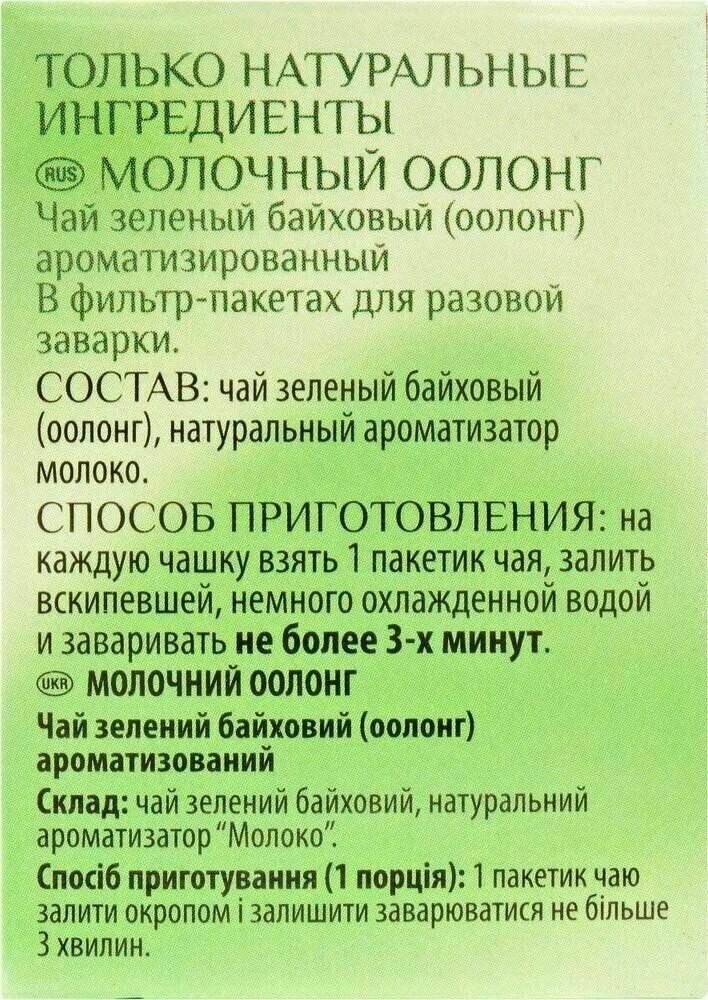 | Состав | Чай зеленый байховый китайский (Оолонг), натуральный ароматизатор молоко |