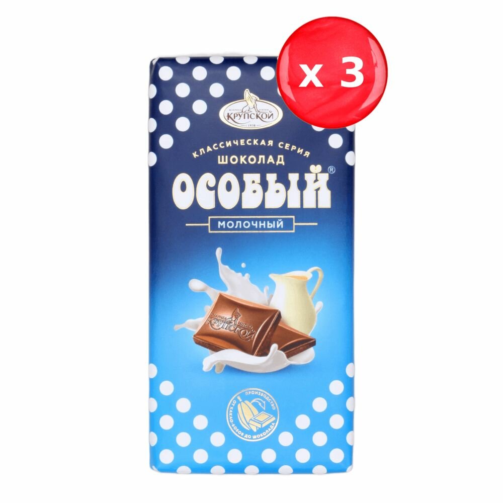 Шоколад молочный Ф. крупской Особый – молочный шоколад с тонкоизмельченными добавлениями, обеспечивающими ему яркий, выразительный и насыщенный вкус. Плитка легко ломается на отдельные фрагменты, поэтому шоколад удобно есть, и им можно делиться. Этот десерт хорошо сочетается с чаем, кофе и какао. Он поднимает настроение и помогает набраться сил во время долгого рабочего дня. Также шоколад можно использовать в кондитерских целях.