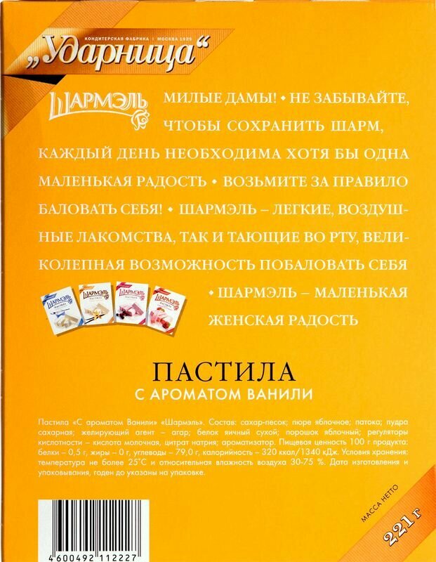 Пастила Шармэль с ароматом ванили 221 г это великолепное лакомство с легкой, нежной, воздушной текстурой и изумительным вкусом, который тает во рту, оставляя утонченное ванильное послевкусие. Очаровательный десерт Шармэль идеально дополнит ваше чаепитие, а также составит великолепную компанию чашке ароматного, насыщенного кофе. Воздушные брусочки пастилы украсят собой праздничный стол и быстро поднимут настроение в обычный день. Это одно из самых любимых лакомств среди сладкоежек всех возрастов.
