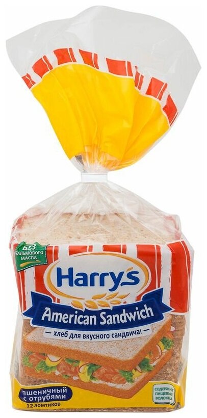 Хлеб сэндвичный пшеничный с отрубями Harry's American Sandwich идеальная основа для любителей вкуснейших и полезных сандвичей и тостов. Пшеничный хлеб с отрубями Harry's American Sandwich простое решение для завтрака, ланча или перекуса. В основе рецептуры пшеничная мука высшего сорта, обогащённая пшеничными отрубями - источником клетчатки. Квадратные ломтики хлеба, подрумяненные в тостере, станут прекрасной основой для классического тоста, сандвича или канапе с разнообразными начинками и сделают каждый день вкуснее