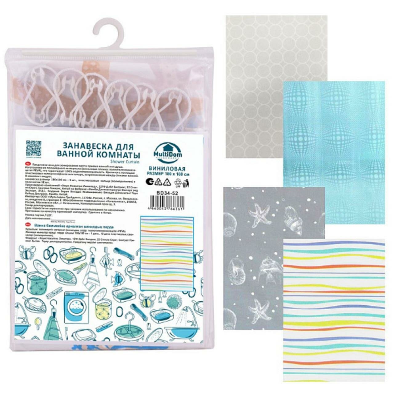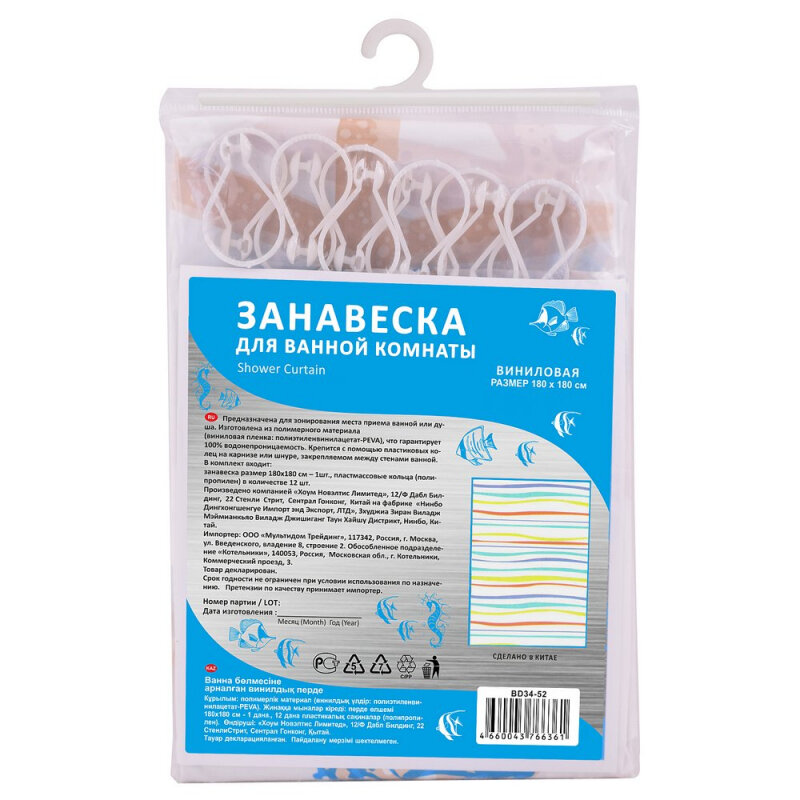 Предназначена для зонирования места приема ванной или душа. Изготовлена из полимерного материала (виниловая пленка: полиэтиленвинилацетат -PEVA), что гарантирует 100% водонепроницаемость. Крепится с помощью пластиковых колец на карнизе или шнуре, зарепляемом между стенами ванной. В комплект входит: занавеска размер 180х180 см - 1 шт., пластмассовые кольца (полипропилен) в количестве 12 шт. Товар представлен в ассортименте, без возможности выбора цвета.