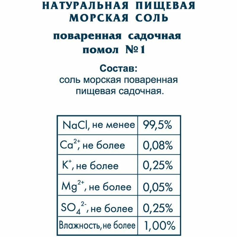 | Состав | соль морская поваренная пищевая садочная. Содержание микроэлементов и минералов |