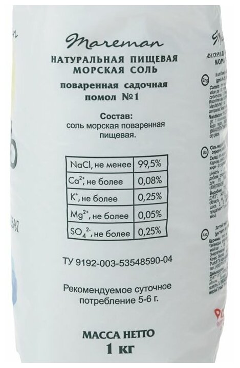 Натуральная морская соль Mareman - полезная альтернатива обычной столовой соли, что соответствует современным потребительскому тренду здорового питания. Морская соль - хороший источник основных природных минералов, натуральный природный продукт, оказывающий оздоровительное воздействие на организм человека при регулярном использовании в пищу. Морская соль образуется выпариванием морской воды под воздействием солнца и ветра. Такой мягкий, естественный способ получения соли способствует сохранению в ней всех минералов и микроэлементов, которые придают морской соли своеобразный вкус и аромат.