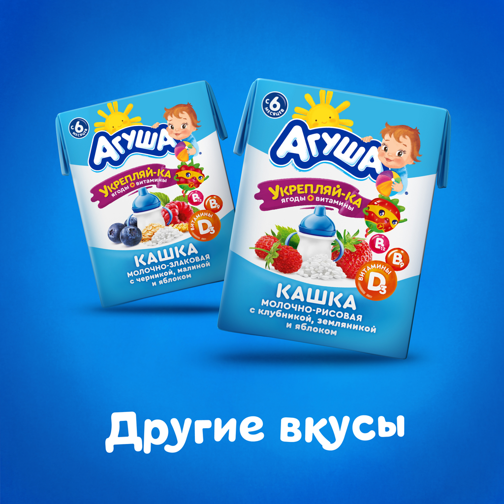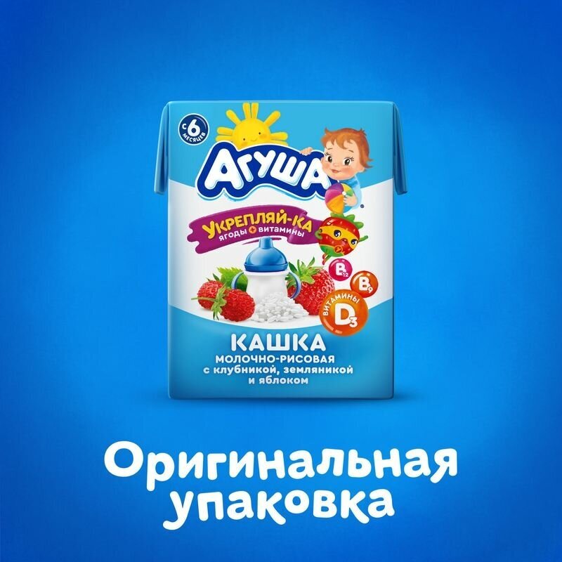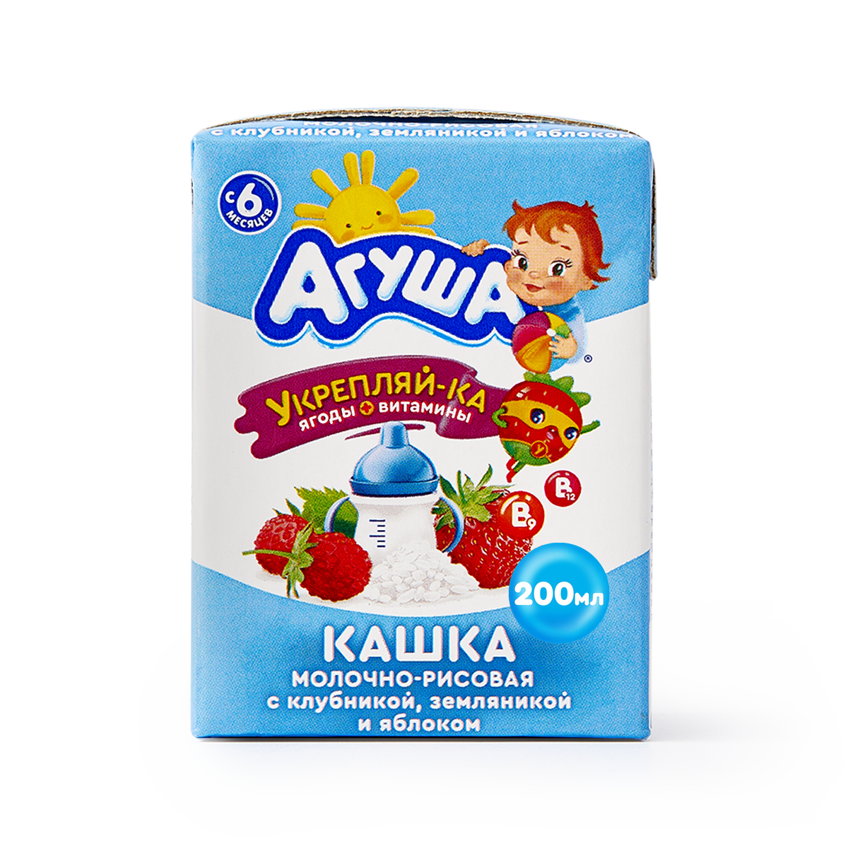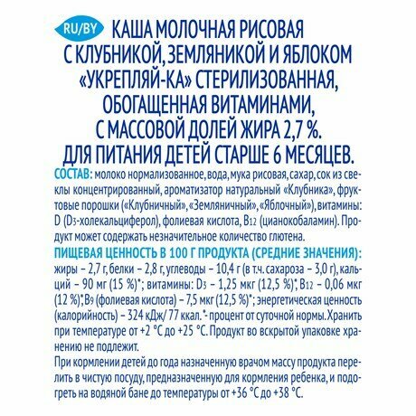 Кашка молочная рисовая с клубникой, земляникой и яблоком «Укрепляй-ка» с массовой долей жира 2,7 % для питания детей от 6 месяцев для кормления в любое время дня. В составе пребиотики и злаки, витамины В12, D3, В9 которые важны для растущего организма.