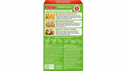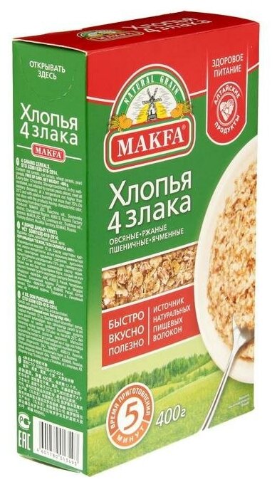 Мультизлаковые хлопья Makfa 4 злака - это природная кладовая растительной клетчатки и незаменимых аминокислот, ценный источник витаминов, минералов и антиоксидантов. В состав входят овсяные, ржаные, пшеничные и ячменные хлопья.
