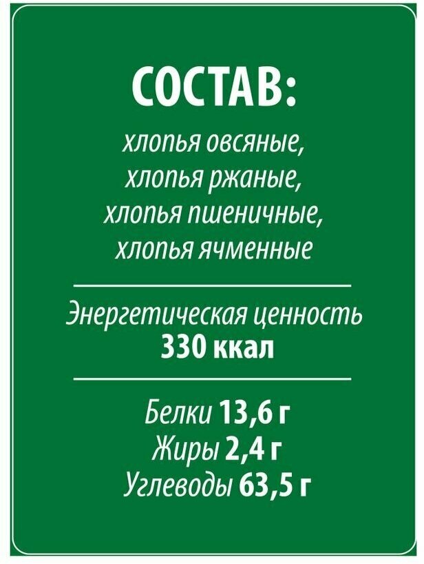 | Состав | хлопья овсяные, хлопья ржаные, хлопья пшеничные, хлопья ячменные |