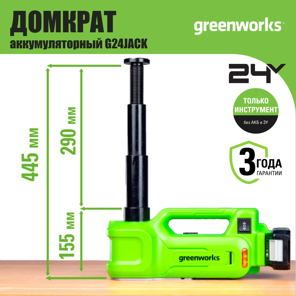 Уникальный инструмент от Greenworks для помощи всем автолюбителям России! Аккумуляторный автомобильный домкрат Greenworks G24JACK поможет обслужить ваш автомобиль в любом месте. Используя аккумуляторную батарею Greenworks POWERALL 24 V, можно заменить проколотое колесо или провести мелкий ремонт автомобиля. Производительный электрогидравлический механизм домкрата позволяет работать с автомобилями снаряжённой массой до 3 тонн. Двойной телескопический шток домкрата оснащён регулируемым винтом, благодаря которому достигается небольшая высота подхвата 155 мм и оптимальная высота подъёма 445 мм. Управление подъёмом и спуском одной кнопкой - максимально удобно и просто. Автоматическая блокировка механизма подъёма позволяет быстро настроить и зафиксировать нужную высоту. LED-подсветка рабочей зоны делает удобной правильную установку опоры домкрата. Аккумуляторный домкрат также оснащён сигнальной индикацией (оранжевого цвета) и аварийным клапаном сброса давления.