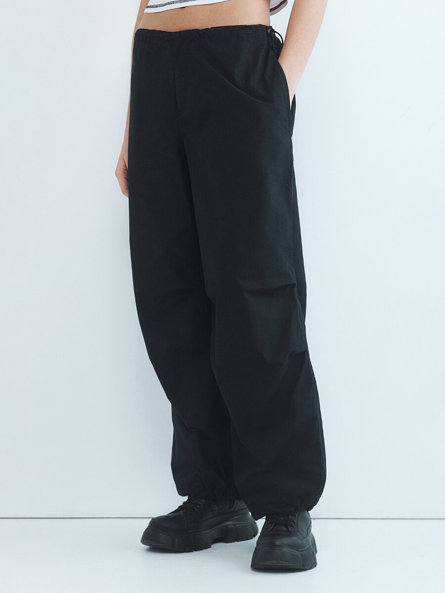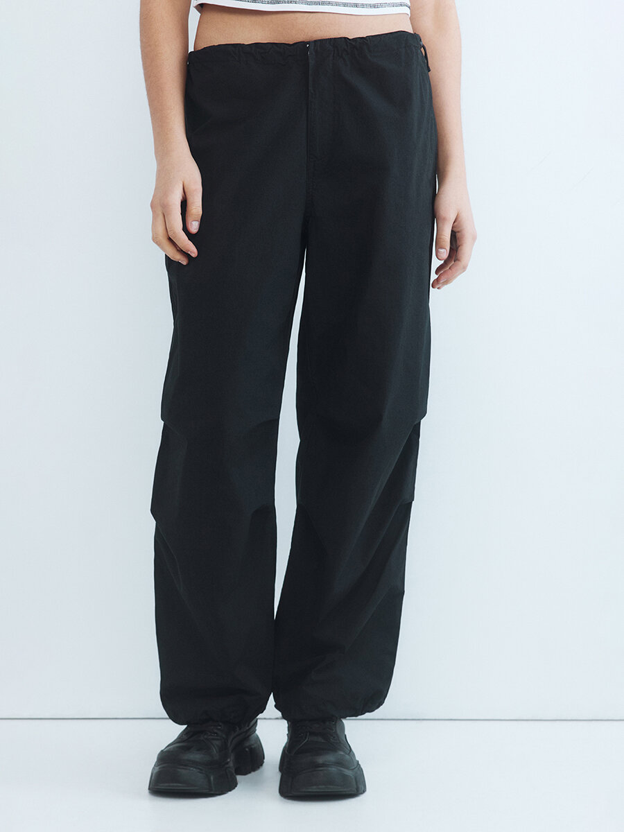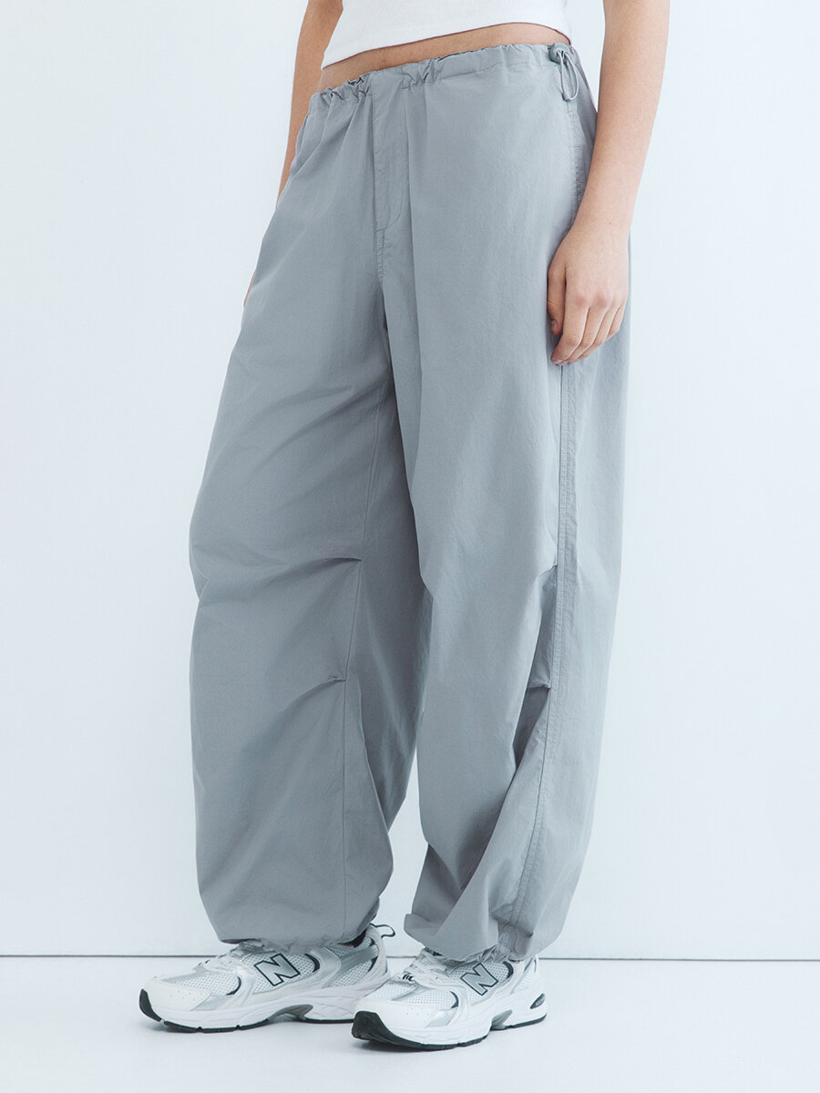 - Брюки-парашюты с низкой посадкой. Широкие женские парашюты свободного кроя из плотной, дышащей 100% хлопковой ткани с гладкой текстильной фактурой