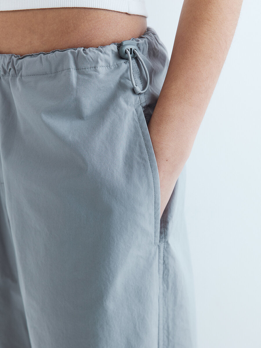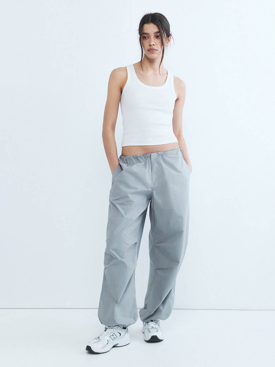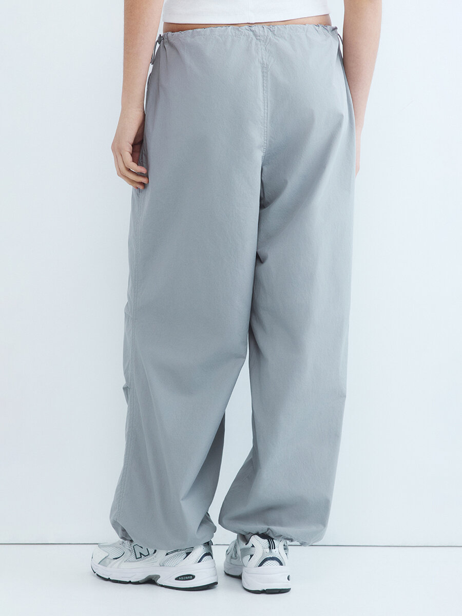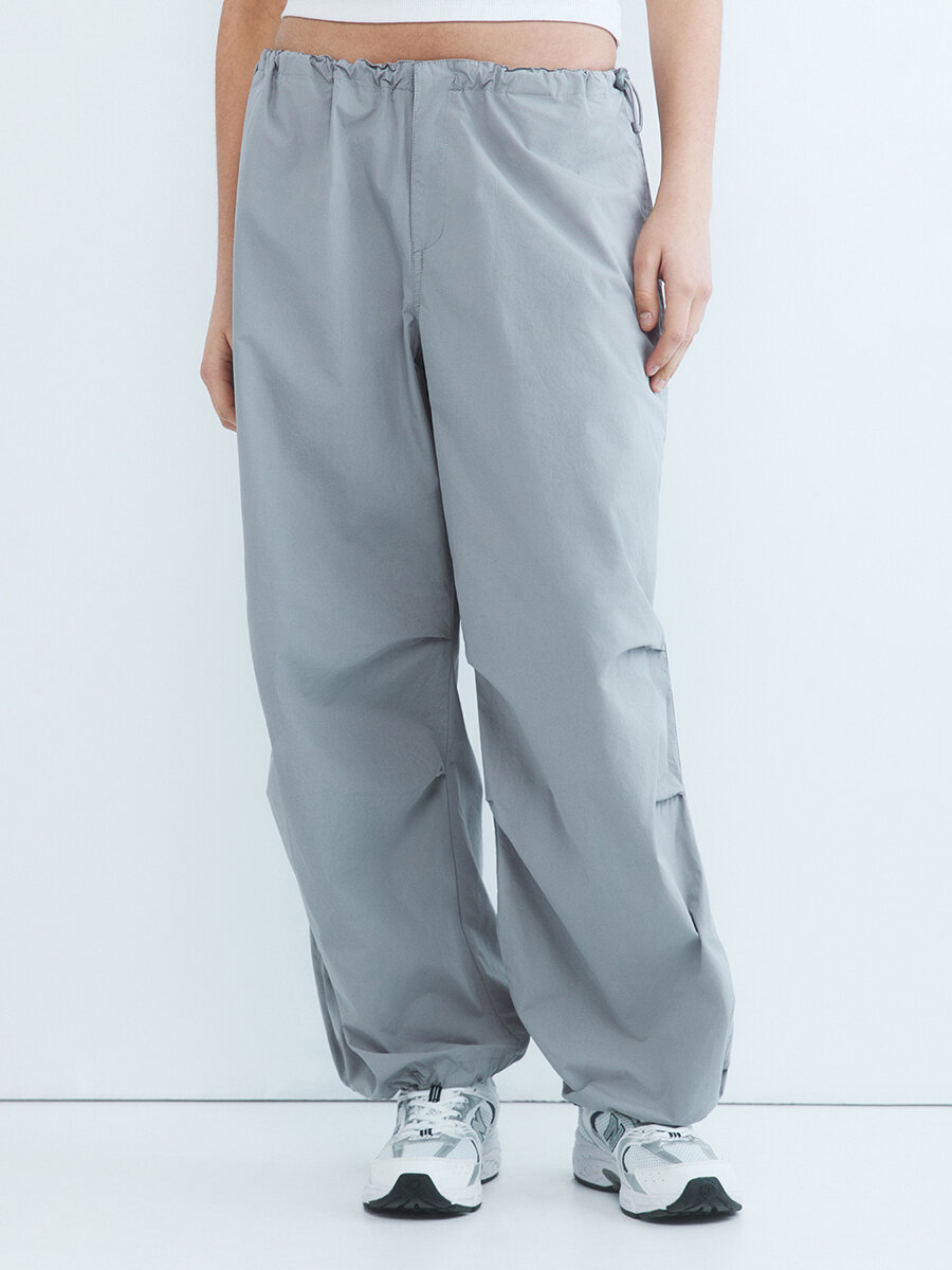 - Брюки-парашюты с низкой посадкой. Широкие женские парашюты свободного кроя из плотной, дышащей 100% хлопковой ткани с гладкой текстильной фактурой