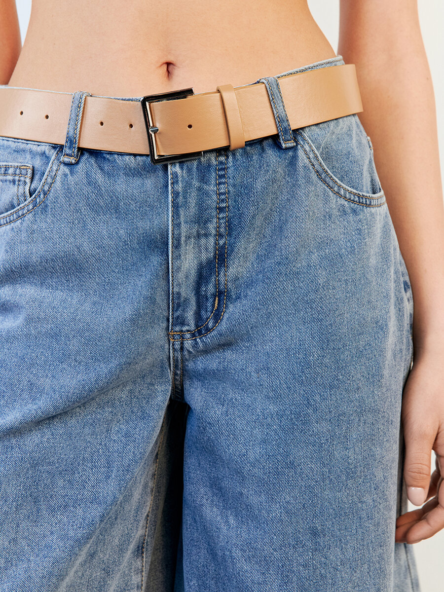 - Голубые джорты с вареным эффектом и светло-коричневым ремнем