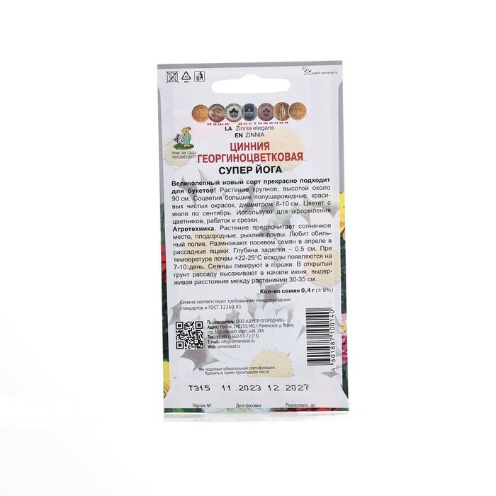 **Семена Цинния Георгиноцветковая «Супер Йога»** предназначены для выращивания высокорослого (около 90 см) однолетника. Крупные полушаровидные соцветия с июля по сентябрь радуют глаз красотой и чистотой окрасок, великолепно смотрятся в букетах. Растение предпочитает солнечные места, хорошо растет на плодородных рыхлых почвах, любит обильный полив. Используется для украшения клумб и рабаток.