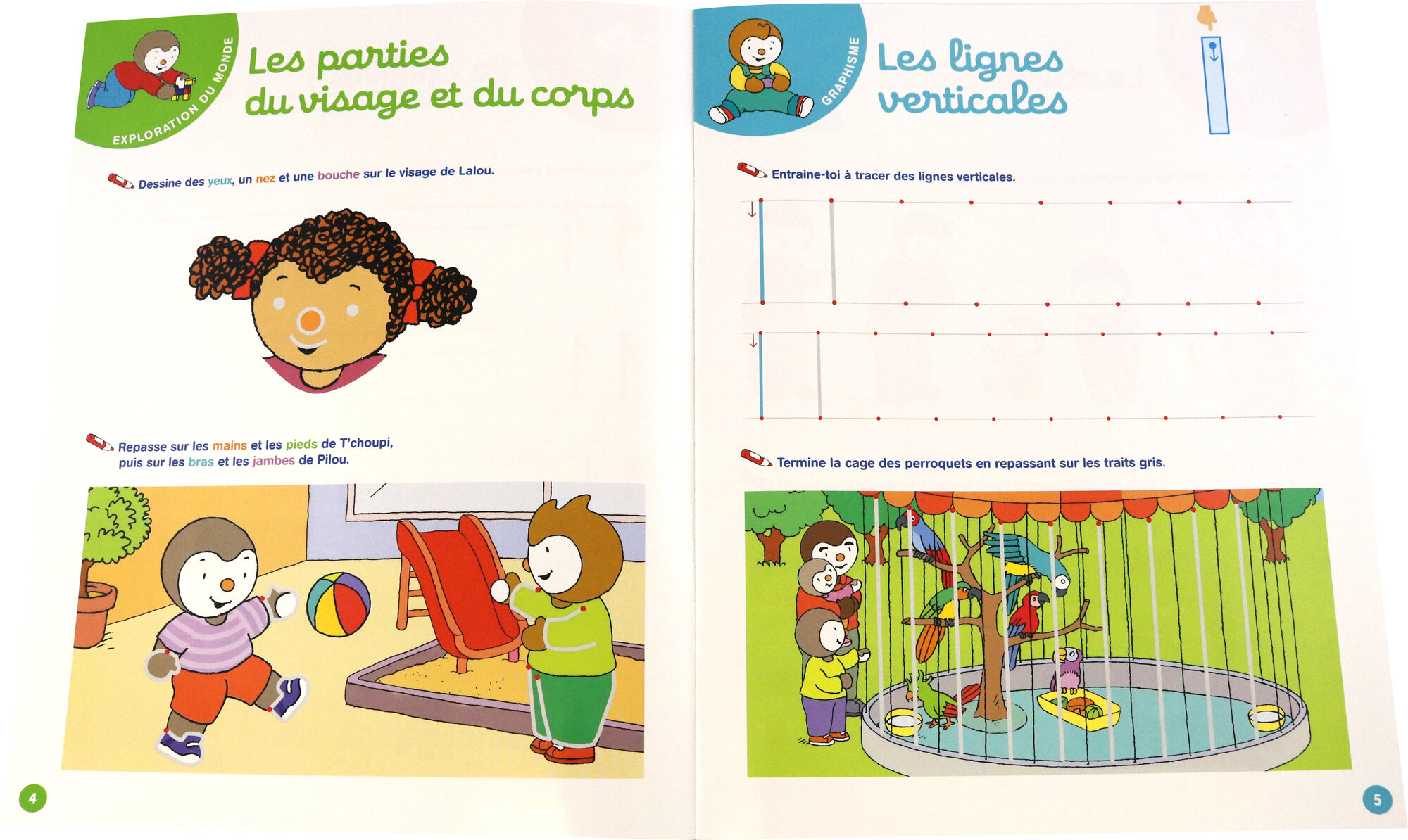 Des modeles fleches pour bien suivre les traces; Des scenes a completer; Un modele a suivre avec le doigt; Une surface effacable pour s'entrainer a volonte.