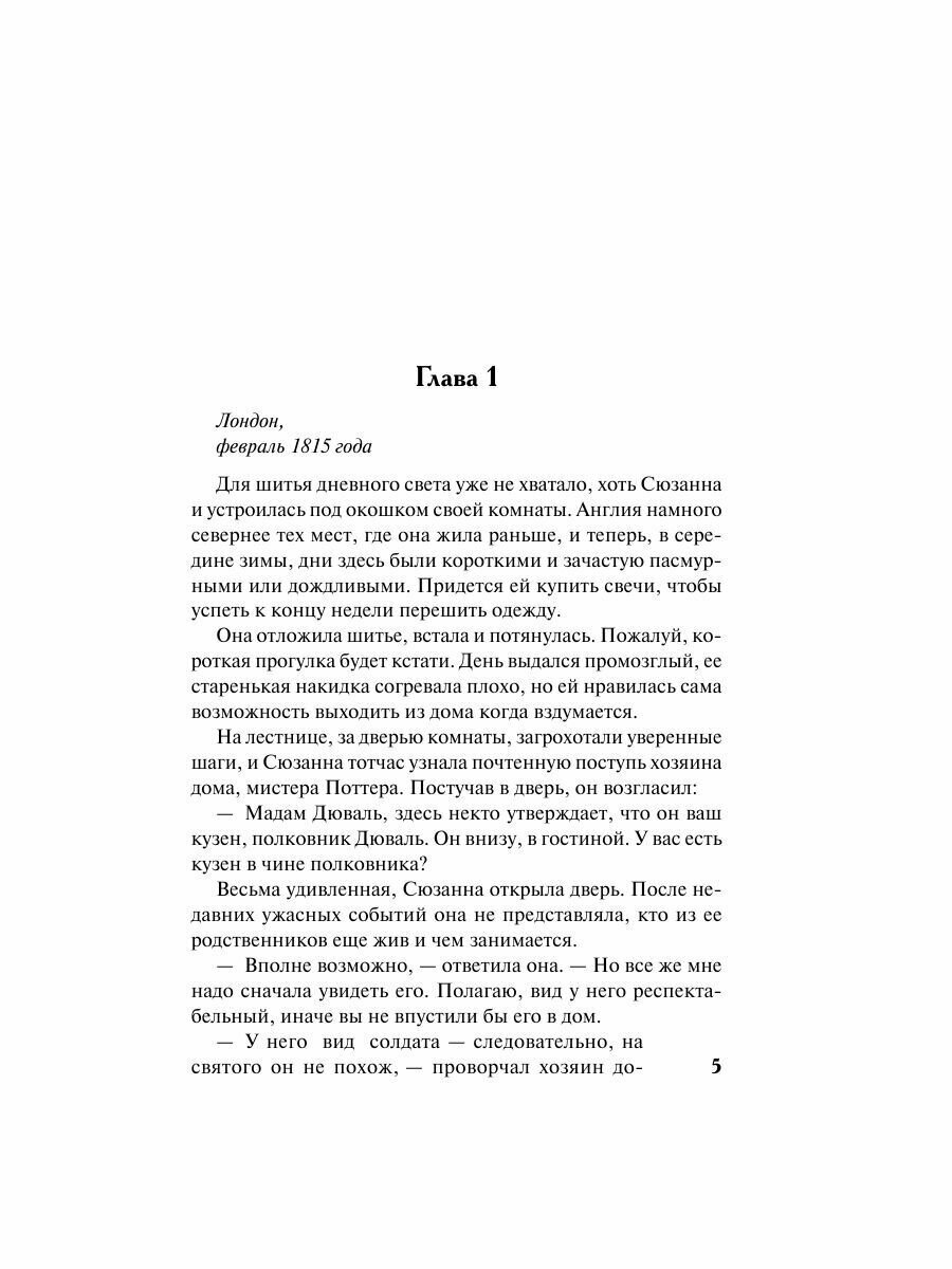 Вступая в брак, измотанный годами трудной службы в военной разведке Саймон Дюваль и молодая вдова его кузена, французская аристократка Сюзанна де Шамброн, всего лишь мечтали о покое и "тихой гавани". Но понемногу их дружба, забота друг о друге и взаимопонимание стали превращаться в куда более нежное чувство. Однако счастье супругов оказалось недолгим - Саймона внезапно отозвали из почетной отставки. И тогда Сюзанна решила стать партнером и помощницей любимого мужа в смертельно опасной схватке с наполеоновскими шпионами.