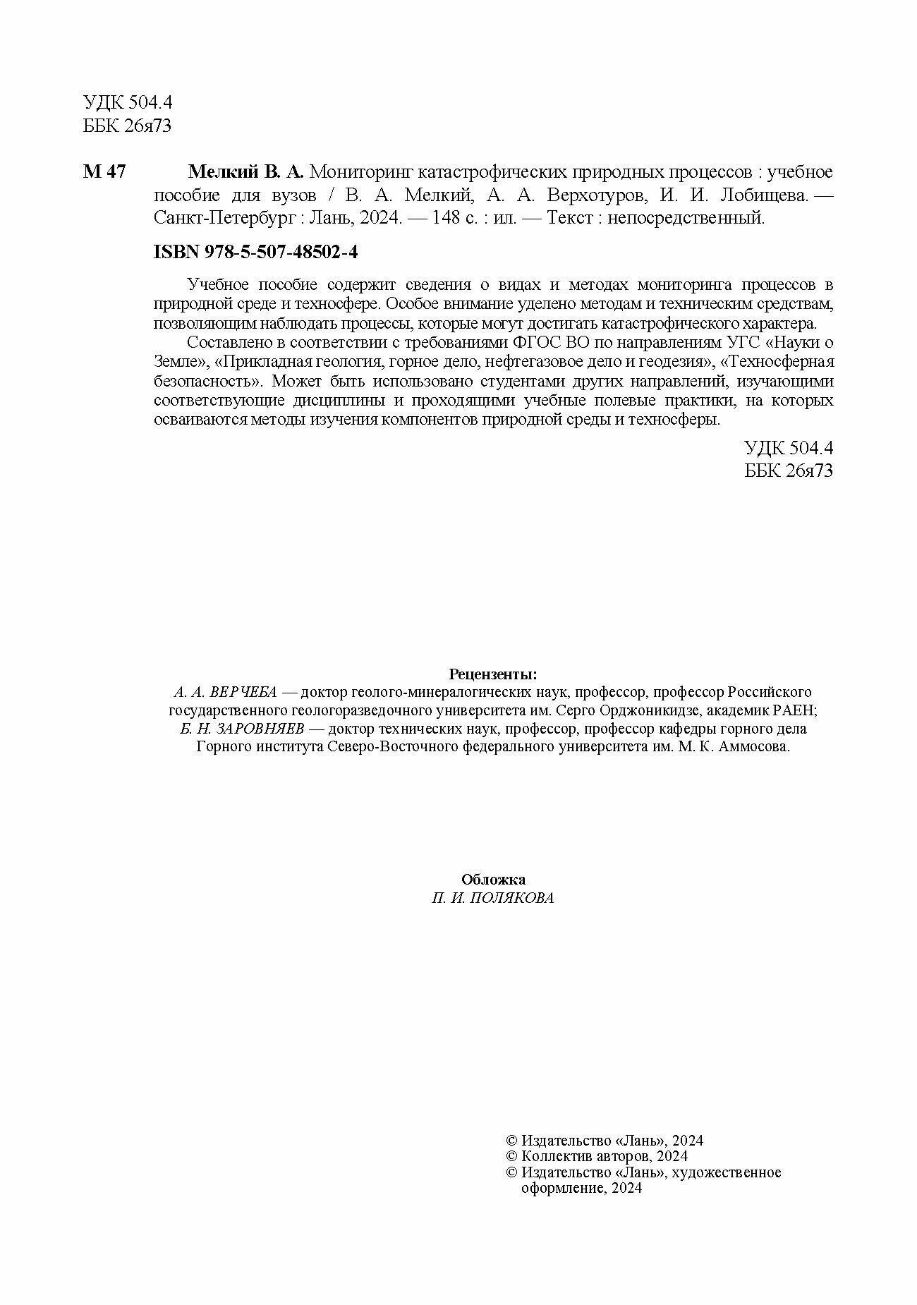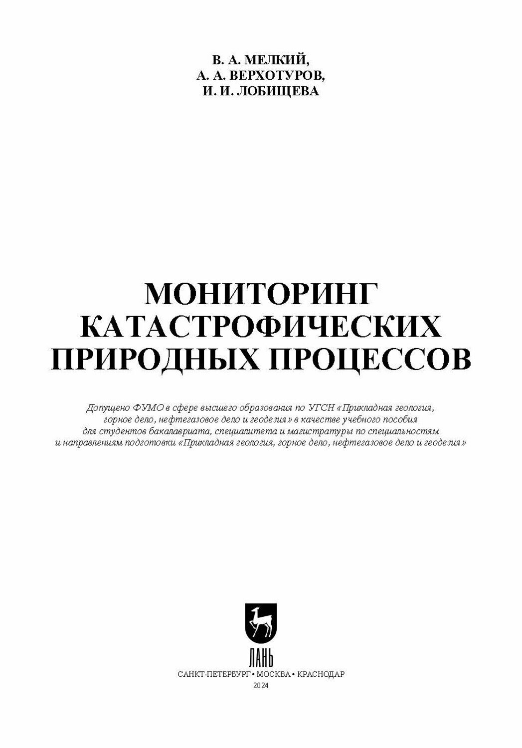 Мониторинг катастрофических природных процессов. Учебное пособие для вузов (Мелкий Вячеслав Анатольевич, Лобищева Инна Ивановна, Верхотуров Алексей Александрович); Лань, 2024