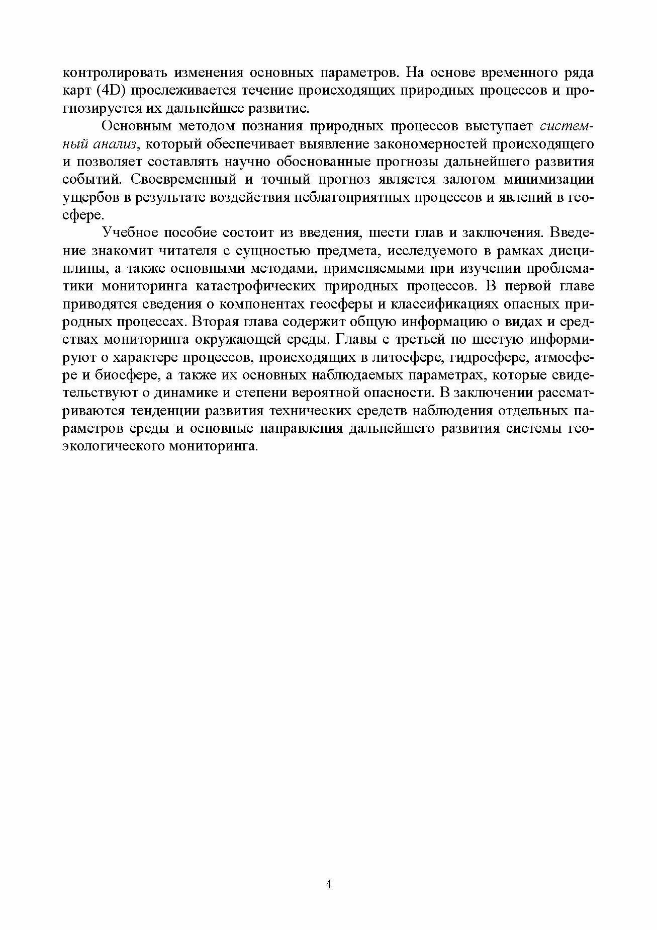 Учебное пособие содержит сведения о видах и методах мониторинга процессов в природной среде и техносфере. Особое внимание уделено методам и техническим средствам, позволяющим наблюдать процессы, которые могут достигать катастрофического характера. Составлено в соответствии с требованиями ФГОС ВО по направлениям УГС «Науки о Земле», «Прикладная геология, горное дело, нефтегазовое дело и геодезия», «Техносферная безопасность». Может быть использовано студентами других направлений, изучающими соответствующие дисциплины и проходящими учебные полевые практики, на которых осваиваются методы изучения компонентов природной среды и техносферы.