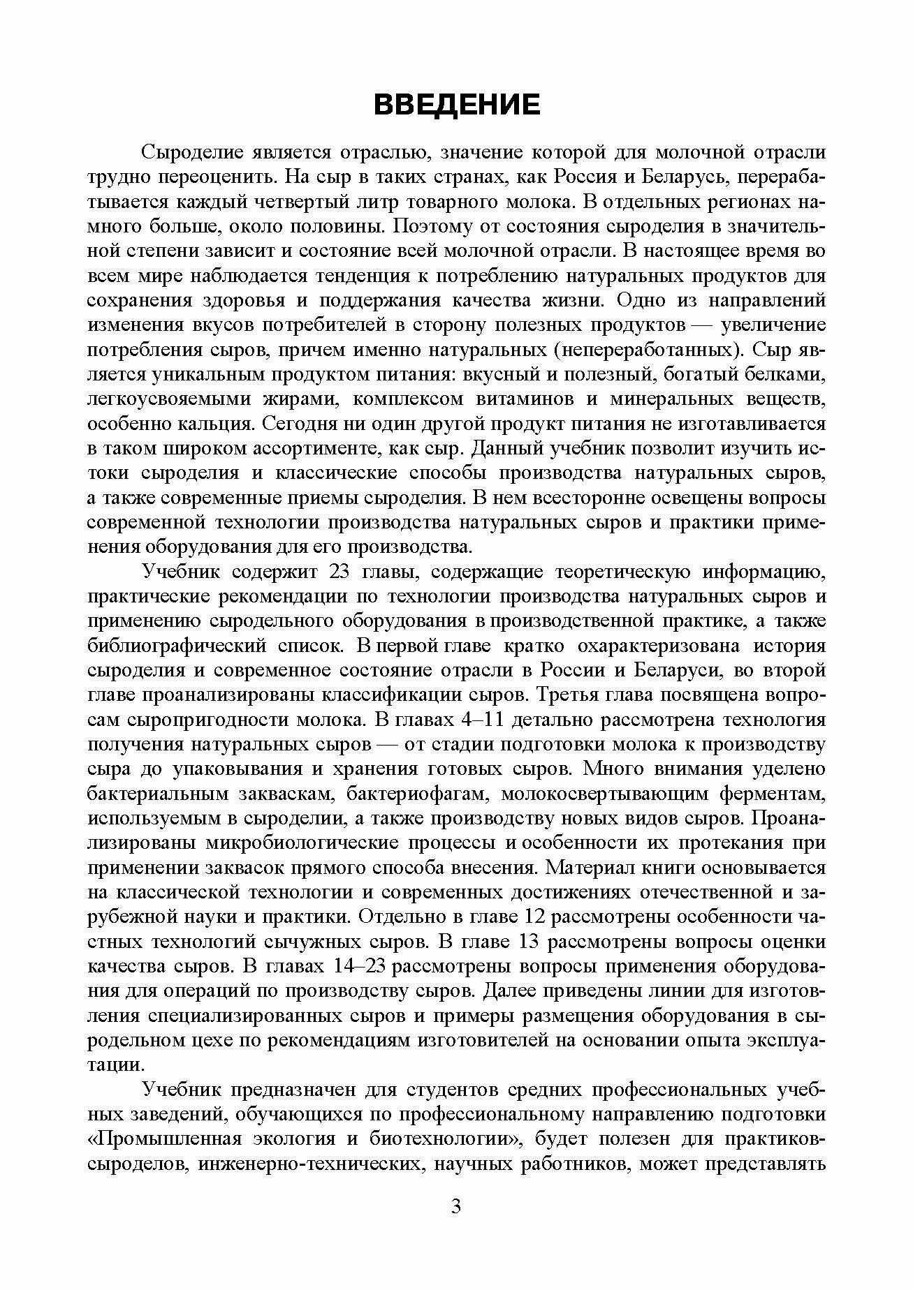 В учебнике рассмотрены вопросы технологии и техники производства сыров. Учебник включает 23 главы, содержащие теорию и практические рекомендации по технологии производства натуральных сыров, а также библиографический список. В первой главе описана история сыроделия и краткая характеристика состояния отрасли, во второй главе даны классификации сыров. Третья глава посвящена важнейшим для получения качественного сыра вопросам сыропригодности молока. В главах 4-12 пошагово рассмотрена технология получения сыров - от стадии подготовки молока до упаковывания и хранения готовой продукции. Описана специфика ряда частных технологий натуральных сычужных сыров. Глава 13 посвящена особенностям оценки качества сыров. В главах 14-23 рассмотрена техническая сторона сыроделия - современное оборудование для осуществления технологических процессов от выработки сырного зерна до подготовки сыров к реализации. Соответствует современным требованиям Федерального государственного образовательного стандарта среднего профессионального образования и профессиональным квалификационным требованиям. Учебник предназначен для учащихся учебных заведений системы СПО, обучающихся по специальностям, входящим в УГСН "Промышленная экология и биотехнологии". 4-е издание, стереотипное.