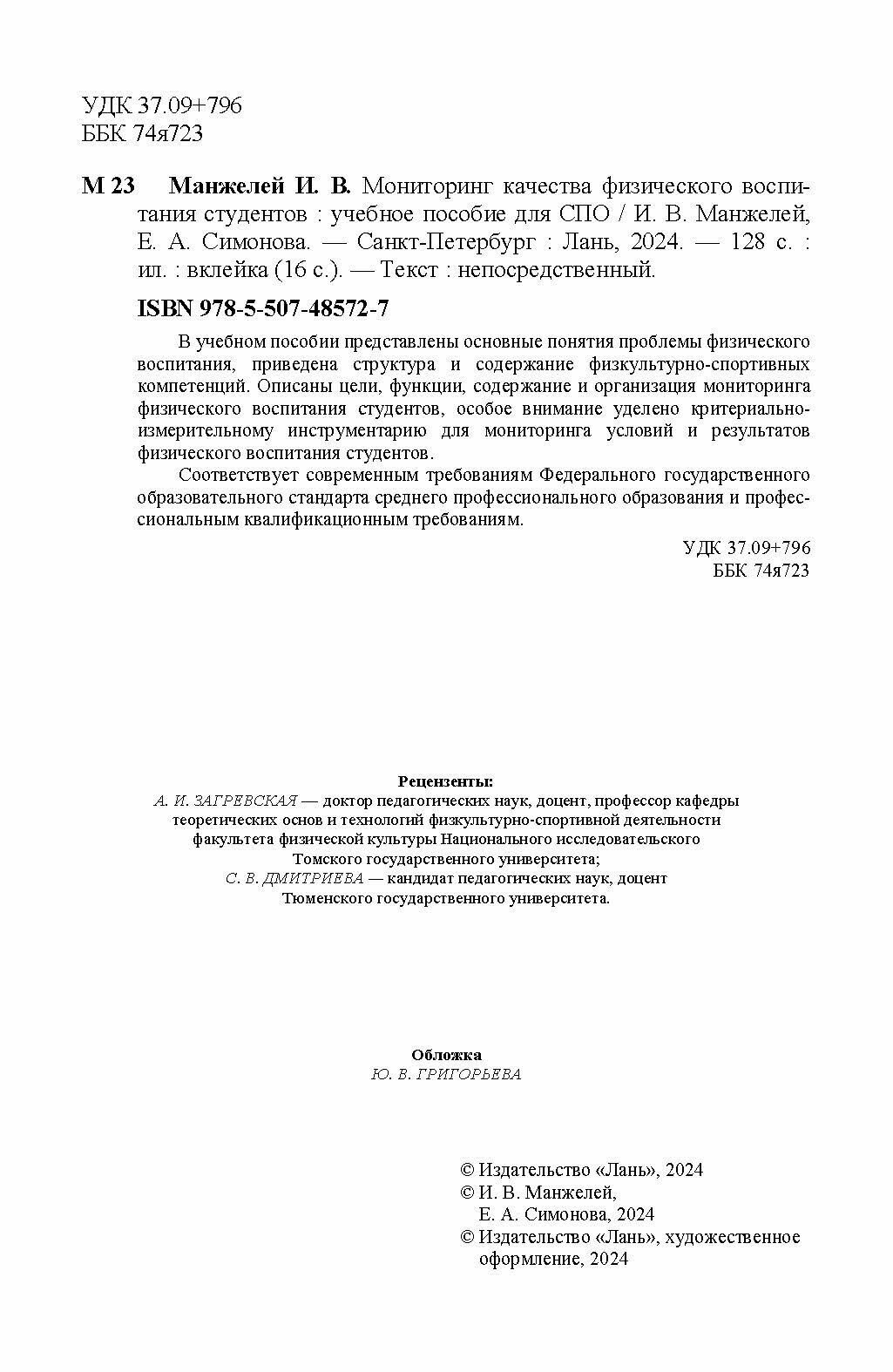 Мониторинг качества физического воспитания студентов. Учебное пособие для СПО (И. В. Манжелей); Издательство ЛАНЬ, 2024