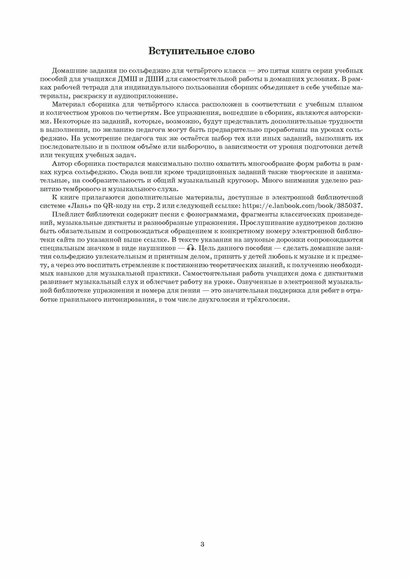 Учебное пособие разработано на основе образовательных программ ДПО для четвертого класса ДМШ и ДШИ в области музыкального искусства и предназначено для изучения сольфеджио в домашних условиях. В формате рабочей тетради для индивидуального пользования объединены учебные материалы по дисциплине "Сольфеджио", а также включены раскраски и аудиоприложение. Пособие может быть полезным преподавателям и родителям для создания благоприятных условий в обучении дома. Материал представлен в занимательной форме и позволит ребенку в полной мере раскрыть его музыкальные таланты. Пособие является интерактивным и содержит QR-код электронной библиотеки музыки для слушания.