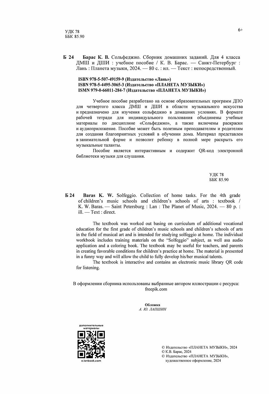 Сольфеджио. Сборник домашних заданий. Для 4 класса ДМШ и ДШИ. Учебное пособие (К. В. Барас); Издательство «Планета музыки», 2024