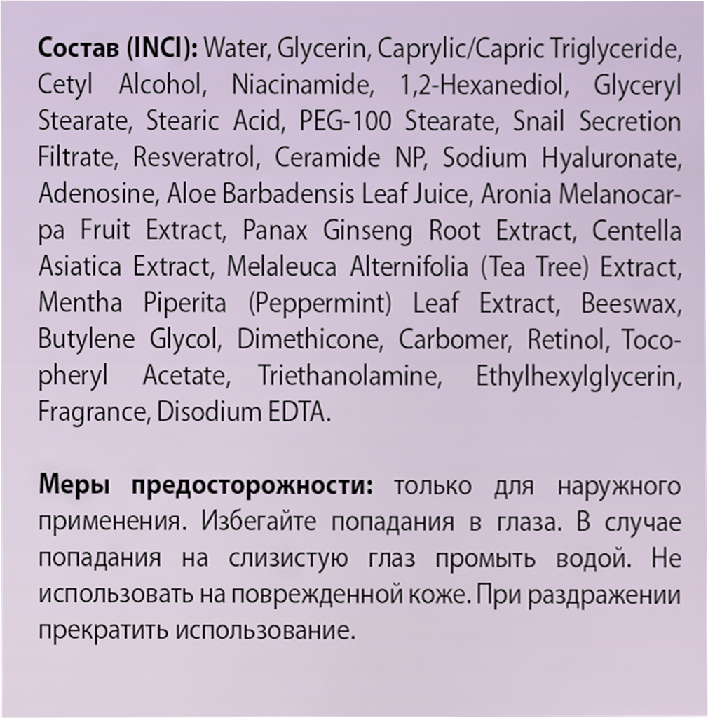 | Состав | water; glycerin; caprylic/capric triglyceride; cetyl alcohol; niacinamide; 1; 2-hexanediol; glyceryl stearate; stearic acid; peg-100 stearate; snail secretion filtrate; resveratrol; ceramide np; sodium hyaluronate; adenosine; aloe barbadensis leaf juice; aronia melanocarpa fruit extract; panax ginseng root extract; centella asiatica extract; melaleuca alternifolia (tea tree) extract; mentha piperita (peppermint) leaf extract; beeswax; butylene glycol; dimethicone; carbomer; retinol; tocopheryl acetate; triethanolamine; ethylhexylglycerin; fragrance; disodium edta |
