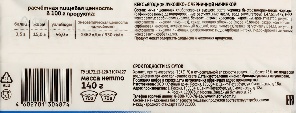 | Состав | мука пшеничная хлебопекарная высшего сорта, черника быстрозамороженная, маргарин (рафинированные дезодорированные растительные масла, вода, эмульгаторы, Е472с, Е475, Е433, консерванты, сорбиновая кислота, бензоат натрия, краситель - каротины, ароматизатор, регулятор кислотности - кислота лимонная), сахар, повидло яблочное (пюре яблочное, сахар, консервант – сорбиновая кислота), меланж яичный жидкий, вода питьевая, патока, загуститель Е1422, регулятор кислотности – кислота лимонная, разрыхлители, гидрокарбонат натрия, гидрокарбонат аммония, консервант-сорбат калия |