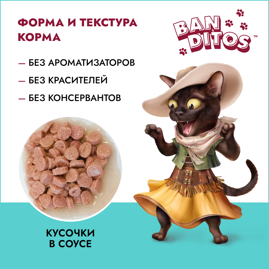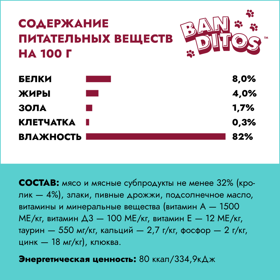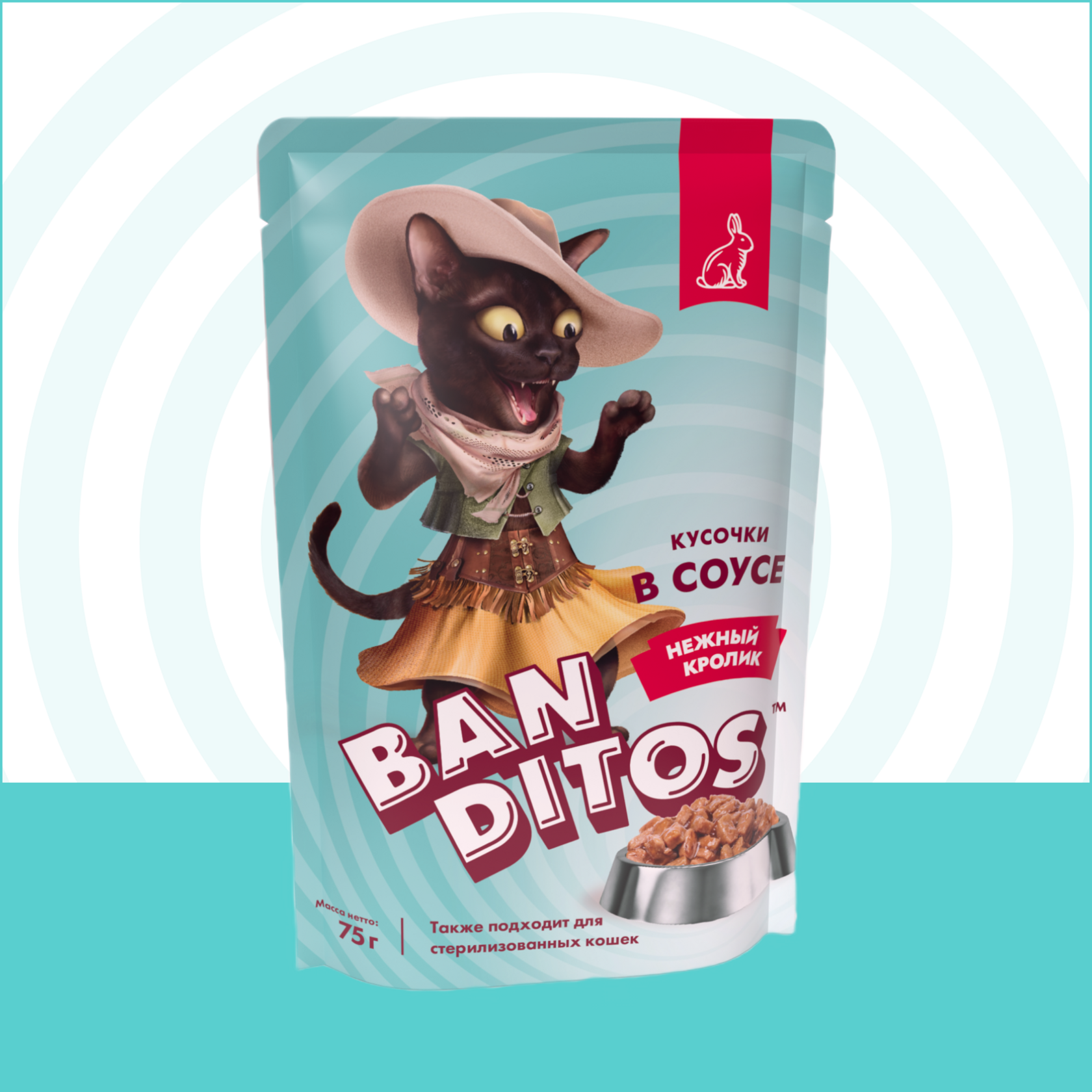 Влажный корм для взрослых кошек BANDITOS с кроликом кусочки в соусе 75 г