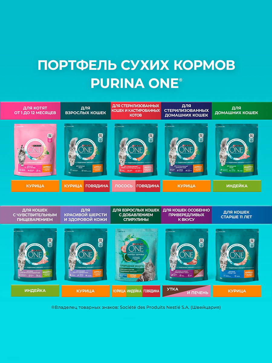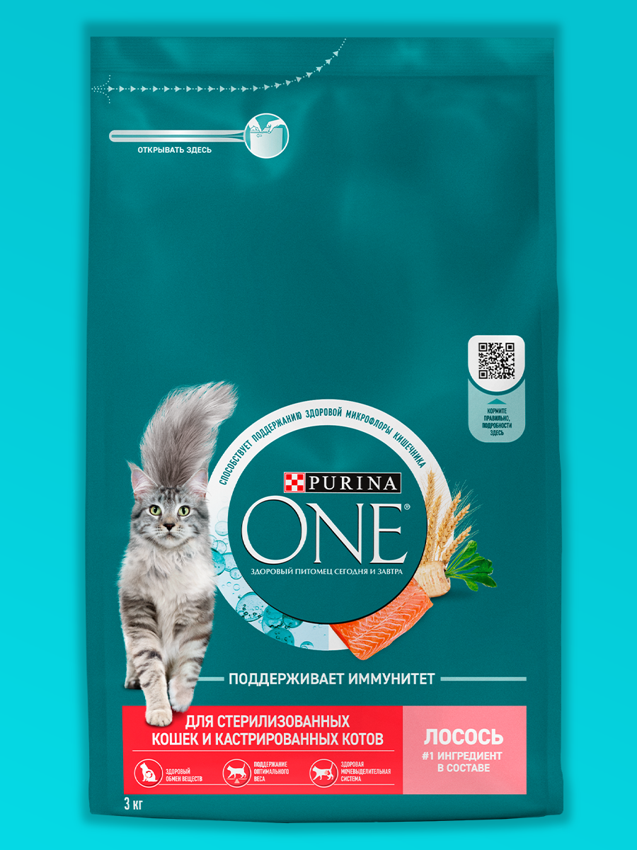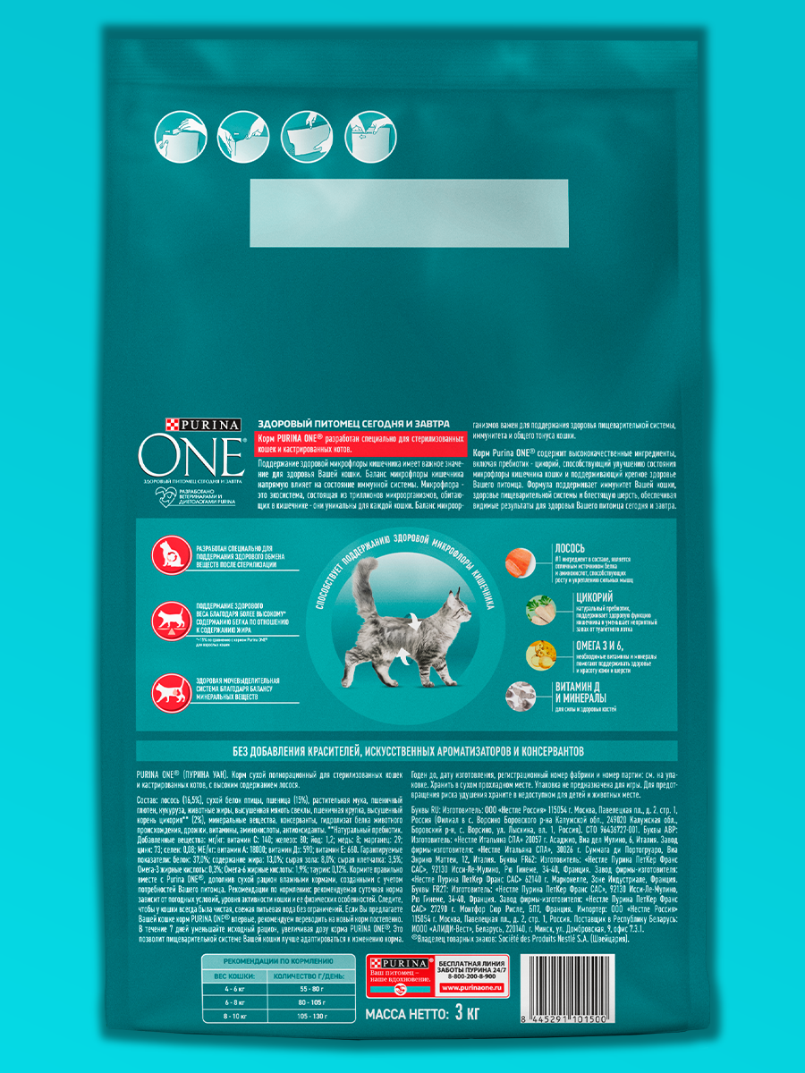 Здоровый питомец сегодня и завтра. Корм Purina ONE разработан специально для стерилизованных кошек и кастрированных котов. Поддержание здоровой микрофлоры кишечника имеет важное значение для здоровья Вашей кошки. Баланс микрофлоры кишечника напрямую влияет на состояние иммунной системы. Микрофлора - это экосистема, состоящая из триллионов микроорганизмов, обитающих в кишечнике - они уникальны для каждой кошки. Баланс микроорганизмов важен для поддержания здоровья пищеварительной системы, иммунитета и общего тонуса кошки. Корм Purina ONE содержит высококачественные ингредиенты, включая пребиотик - цикорий, способствующий улучшению состояния микрофлоры кишечника кошки и поддерживающий крепкое здоровье Вашего питомца. Формула поддерживает иммунитет Вашей кошки, здоровье пищеварительной системы и блестящую шерсть, обеспечивая видимые результаты для здоровья Вашего питомца сегодня и завтра.
