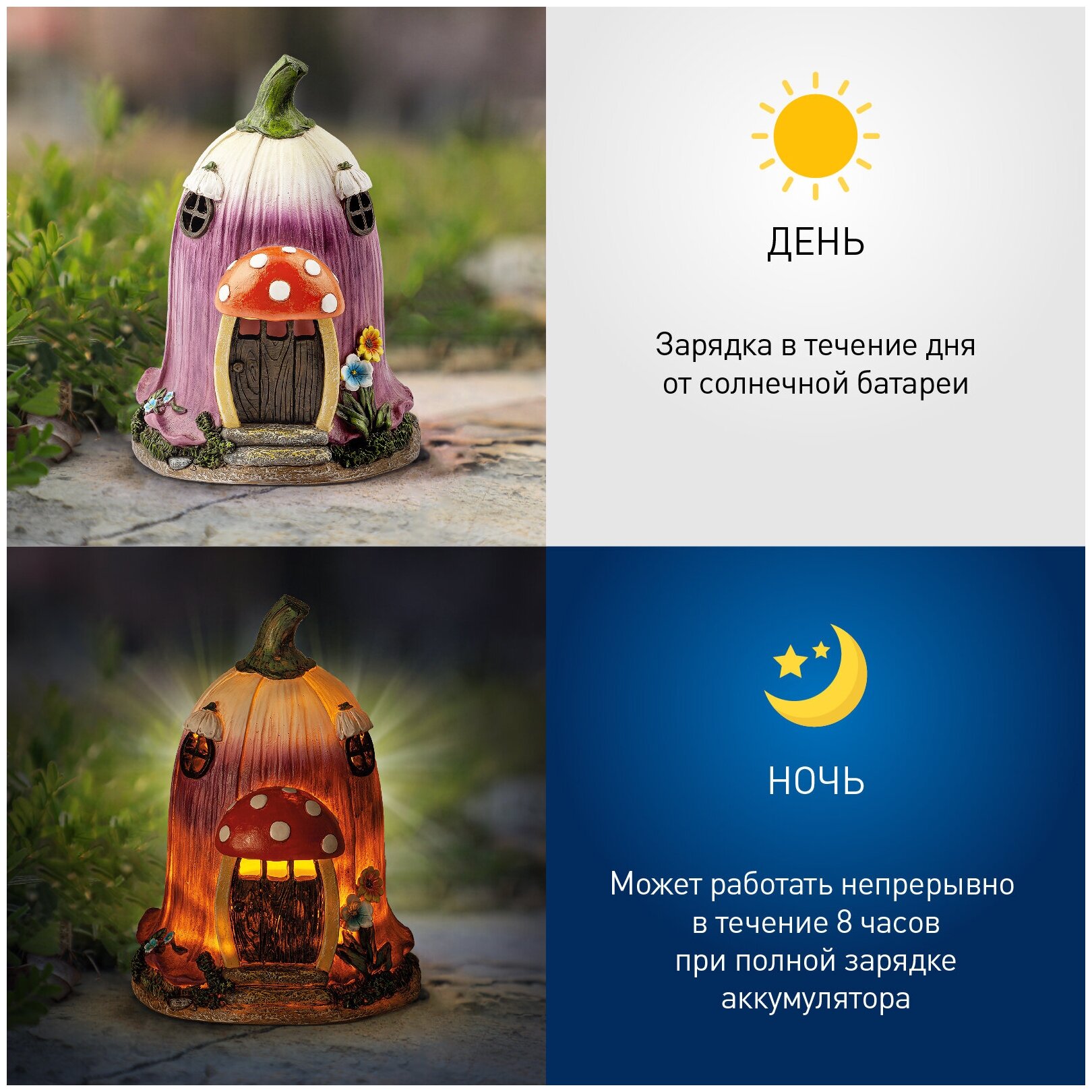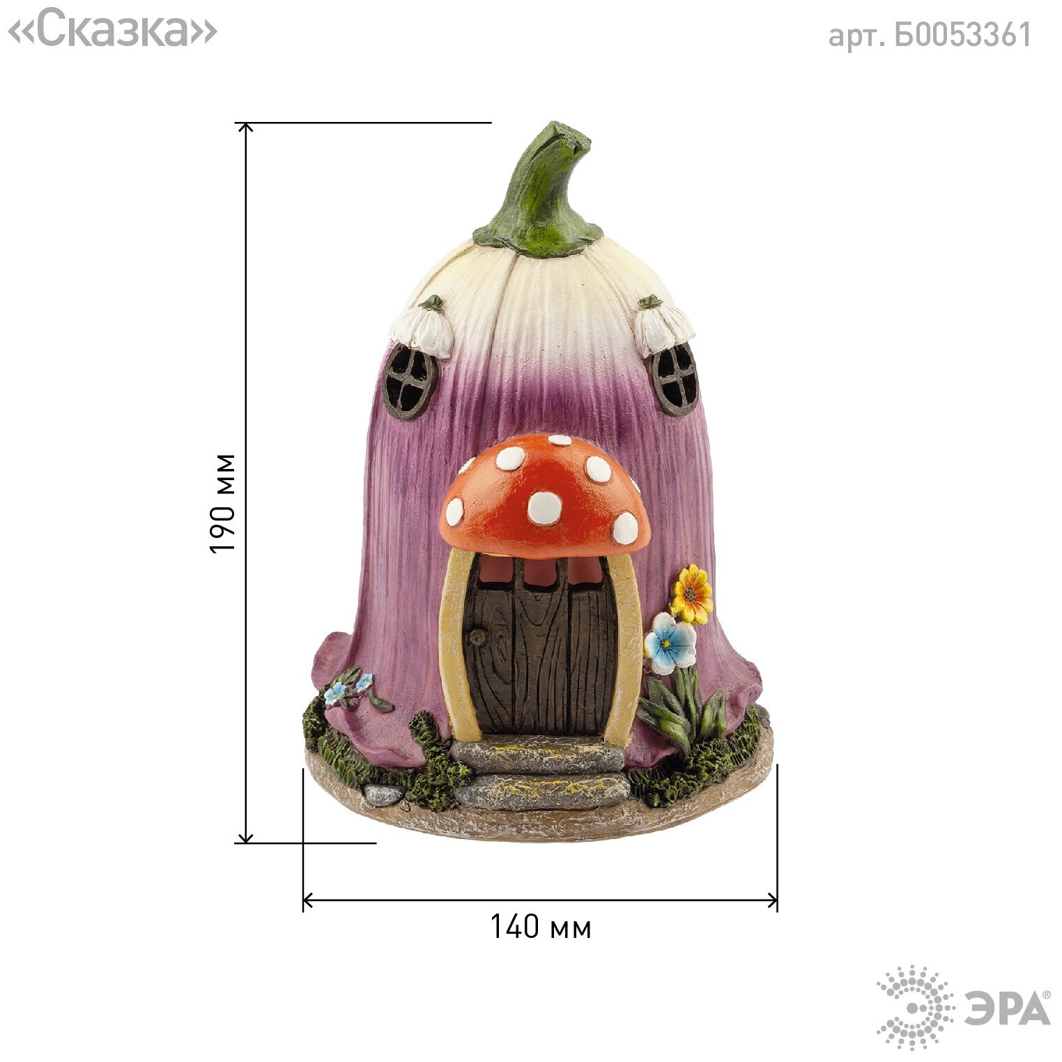Светильник садовый ERASF22-12 «Сказка» 19см уличный на солнечн. батареях Эра Б0053361Фигурка садовая "Сказка" от бренда ЭРА станет очаровательным декором Вашего садового участка! Этот уличный светодиодный светильник, напоминающий жилище гномика, преобразит территорию у дома - можно украсить им клумбу, альпийскую горку, подсветить тропинку или террасу дачи. Миниатюрный фонарь ERASF22-12 высотой 19 см выполнен из полистоуна и тщательно детализирован. Беспроводной садовый светильник работает на солнечной батарее, этот тип получения энергии является самым экологичным, энергоемким, а также бесшумным. Питание происходит во включенном режиме в солнечную погоду, фигурка сама загорается с наступлением ночи и работает до 8 часов. Сказочный домик с теплым светом наполнит Ваш сад уютом и таинственностью!