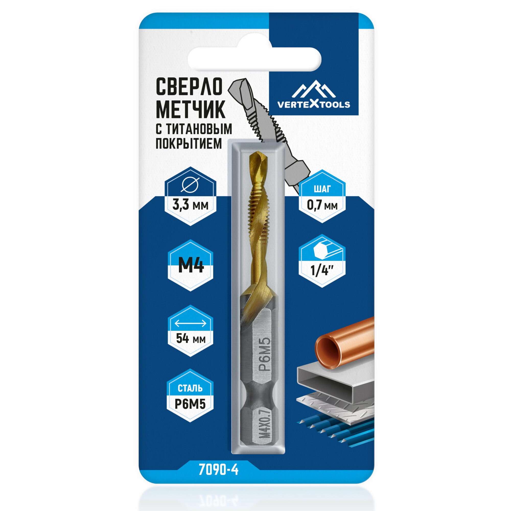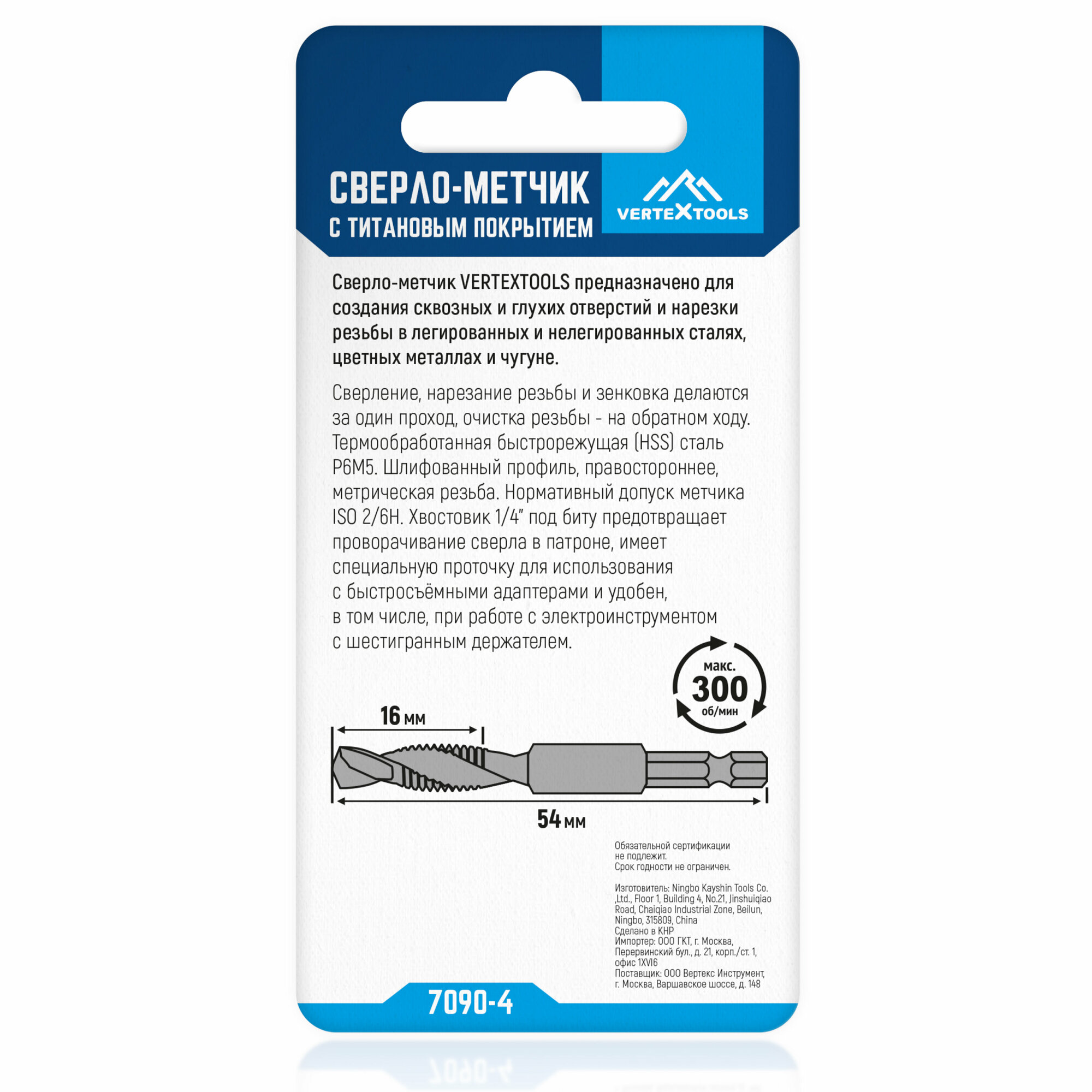 **Сверло-метчик по металлу Р6М5 Vertextools 7090-4 ** используется для формирования закрытых и проходящих насквозь отверстий, и резьбовой нарезки в чугуне, цветных металлах, стали. За один проход делается сверление, создание резьбы и зенковка. В процессе обратного хода выполняется очищение резьбы. Благодаря хвостовику под биту не допускается проворачивание в патроне сверла. У него есть специальная проточка для применения с быстросъемными адаптерами. Его удобно использовать с электрическим инструментом с 6-гранным держателем.