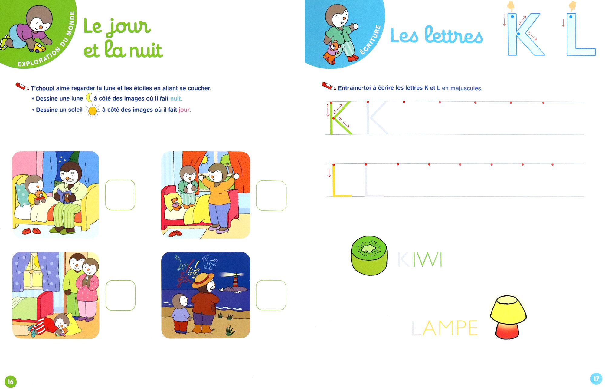 Des modeles fleches pour bien suivre les traces; des mots a completer; des modeles a suivre avec le doigt et une surface effacable pour s'entrainer a volonte.
