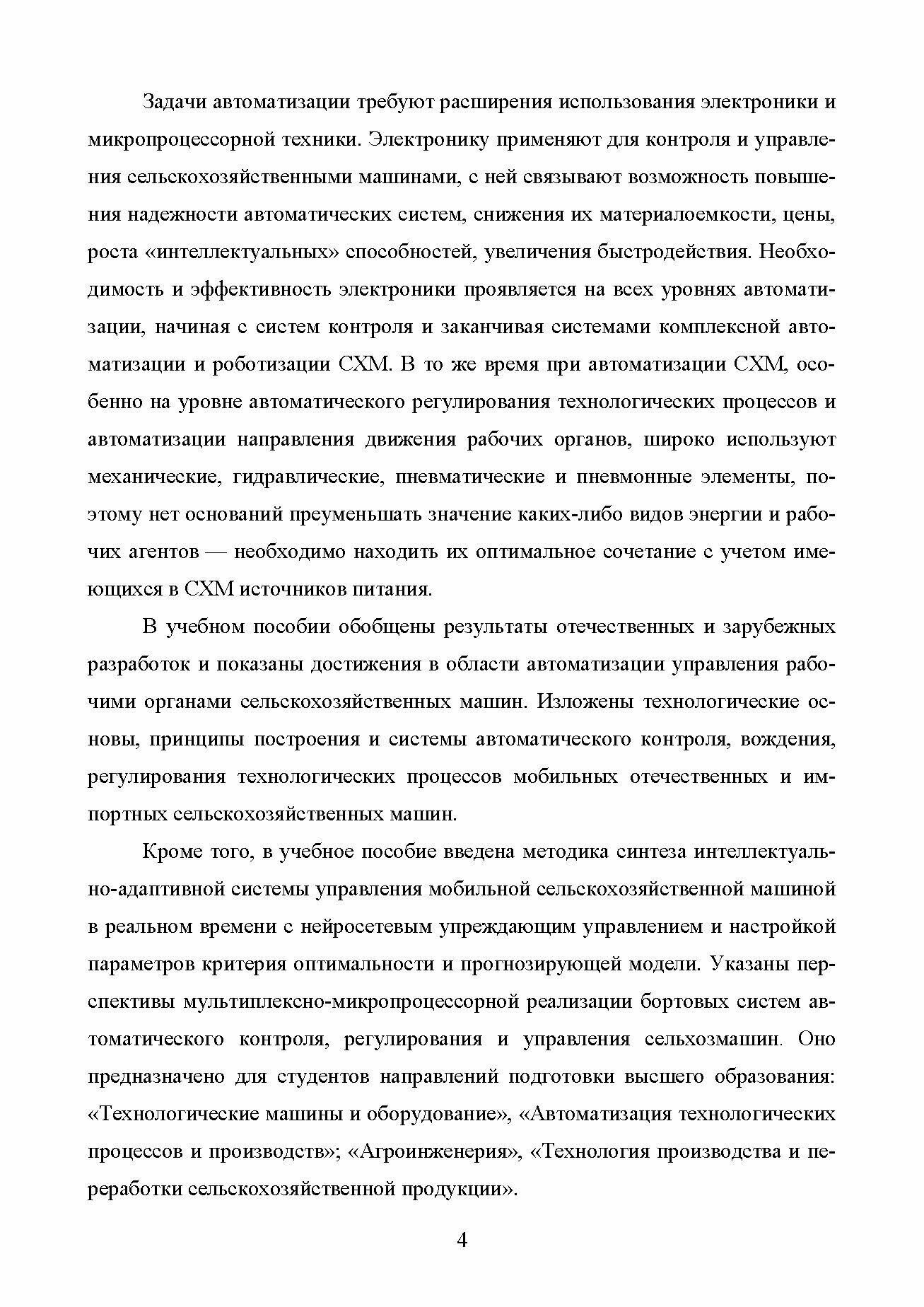 В учебном пособии обобщены результаты отечественных и зарубежных разработок и показаны достижения в области автоматизации управления рабочими органами сельскохозяйственных машин. Изложены технологические основы, принципы построения и системы автоматического контроля, вождения, регулирования технологических процессов мобильных отечественных и импортных сельскохозяйственных машин. Предлагается методика синтеза интелелектуально-адаптивной системы управления мобильной сельскохозяйственной машиной в реальном времени с нейросетевым упреждающим управлением и настройкой параметров критерия оптимальности и прогнозирующей модели. Указаны перспективы мультиплексно-микропроцессорной реализации бортовых систем автоматического контроля, регулирования и управления сельхозмашин. Соответствует современным требованиям Федерального государственного образовательного стандарта среднего профессионального образования и профессиональным квалификационным требованиям. Пособие предназначено для студентов средних специальных учебных заведений.