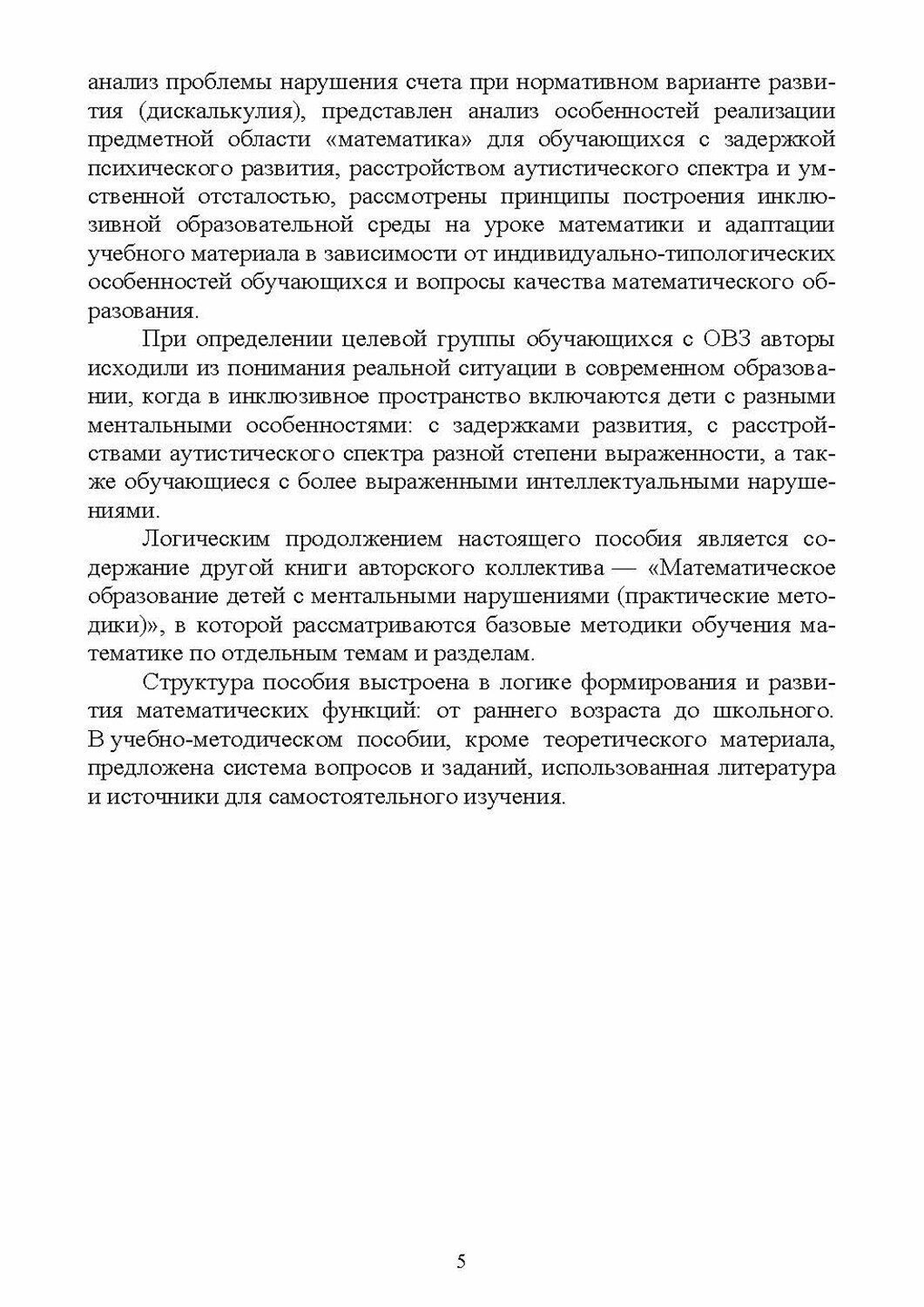 В пособии рассмотрены теоретические подходы к математическому образованию обучающихся с ментальными нарушениями развития в условиях инклюзии. В качестве целевой группы авторами рассмотрены дети с задержкой психического развития, расстройством аутистического спектра и умственной отсталостью (интеллектуальными нарушениями) как самые многочисленные группы обучающихся с ограниченными возможностями здоровья. Меняющиеся нормативно-правовые условия, современное понимание особых образовательных потребностей обучающихся с ментальными нарушениями и их социальной ситуации развития обуславливают требования к системе работы педагогического коллектива инклюзивной школы, необходимость расширения педагогами своих профессиональных компетенций с целью овладения особыми подходами обучения и воспитания, специальными образовательными технологиями и необходимостью прогнозирования перспективы их жизнеустройства. Содержание учебного пособия ориентировано на студентов вузов, осваивающих программы по направлению подготовки "Специальное (дефектологическое) образование" по профилям "Логопедия" и "Олигофренопедагогика", может быть полезно инклюзивным педагогам - слушателям дополнительных профессиональных программ повышения квалификации, а также родителям детей с ментальными нарушениями развития.