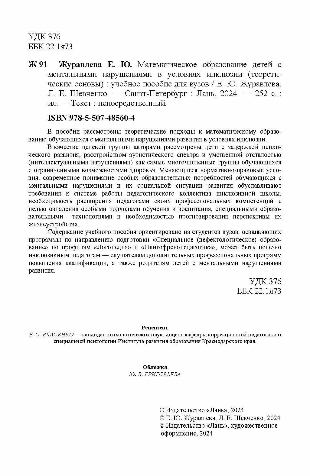 Математическое образование детей с ментальными нарушениями в условиях инклюзии. Теоретические основы (Е. Ю. Журавлева); Издательство ЛАНЬ, 2024