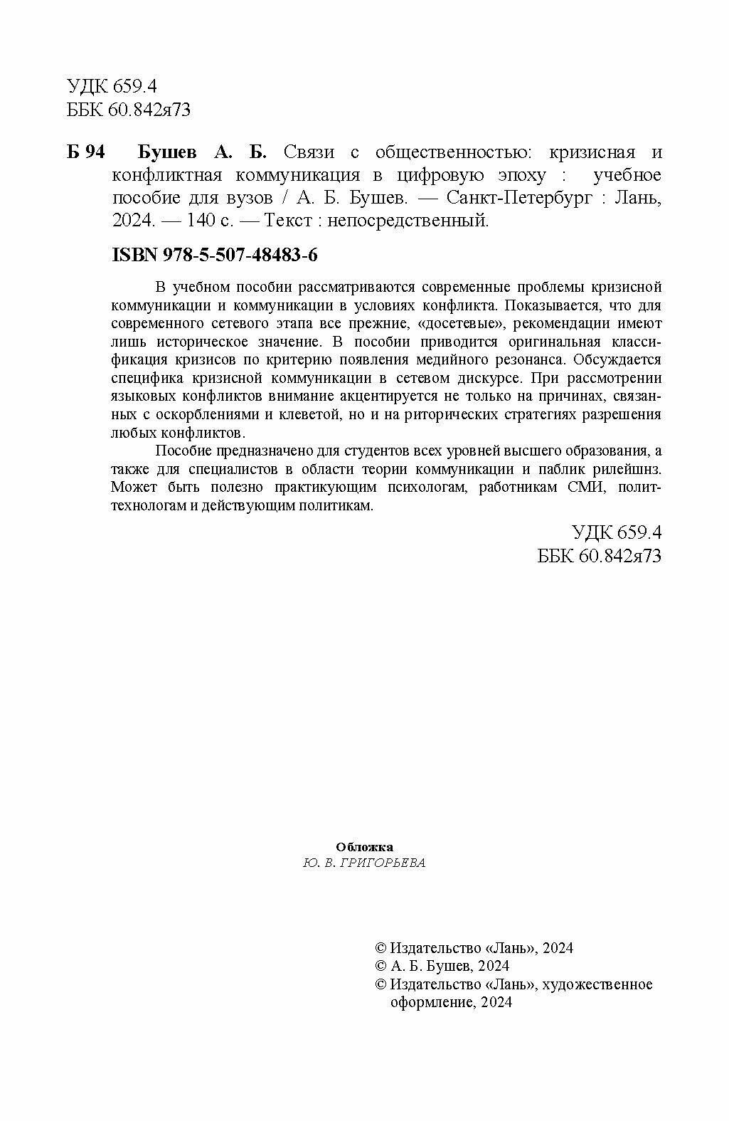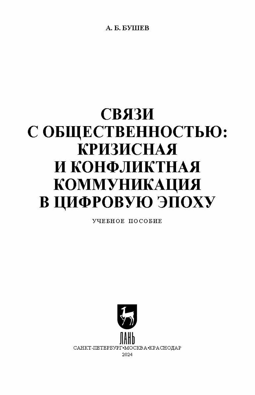 Связи с общественностью. Кризисная и конфликтная коммуникация в цифровую эпоху. Учебное пособие (А. Б. Бушев); Издательство ЛАНЬ, 2024