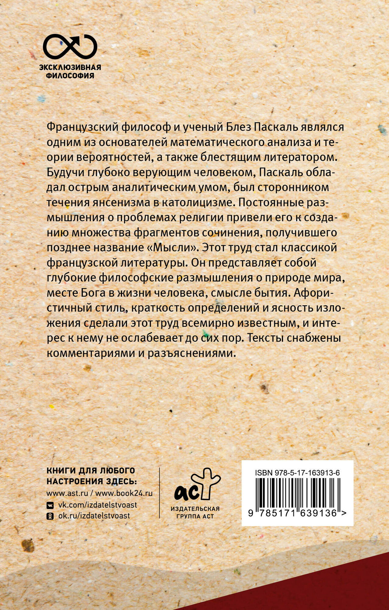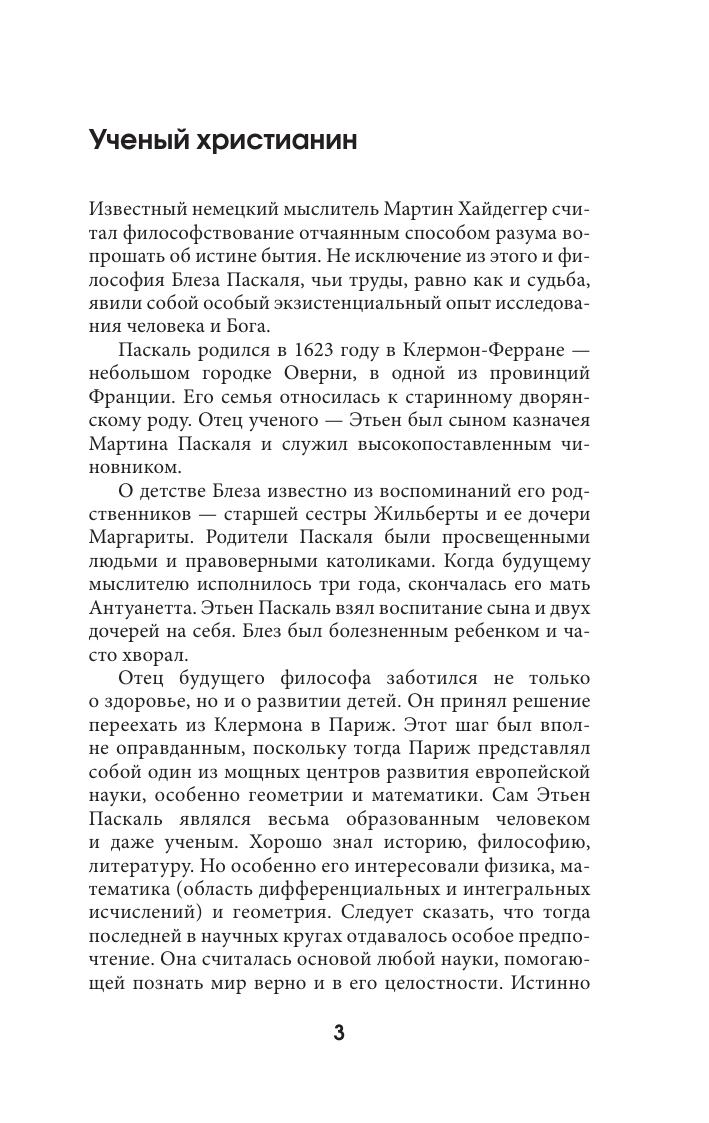 Французский философ и ученый Блез Паскаль являлся одним из основателей математического анализа и теории вероятностей, а также блестящим литератором. Будучи глубоко верующим человеком, Паскаль обладал острым аналитическим умом, был сторонником течения янсенизма в католицизме. Постоянные размышления о проблемах религии привели его к созданию множества фрагментов сочинения, получившего позднее название "Мысли". Этот труд стал классикой французской литературы. Он представляет собой глубокие философские размышления о природе мира, месте Бога в жизни человека, смысле бытия. Афористичный стиль, краткость определений и ясность изложения сделали этот труд всемирно известным, и интерес к нему не ослабевает до сих пор. Тексты снабжены комментариями и разъяснениями.