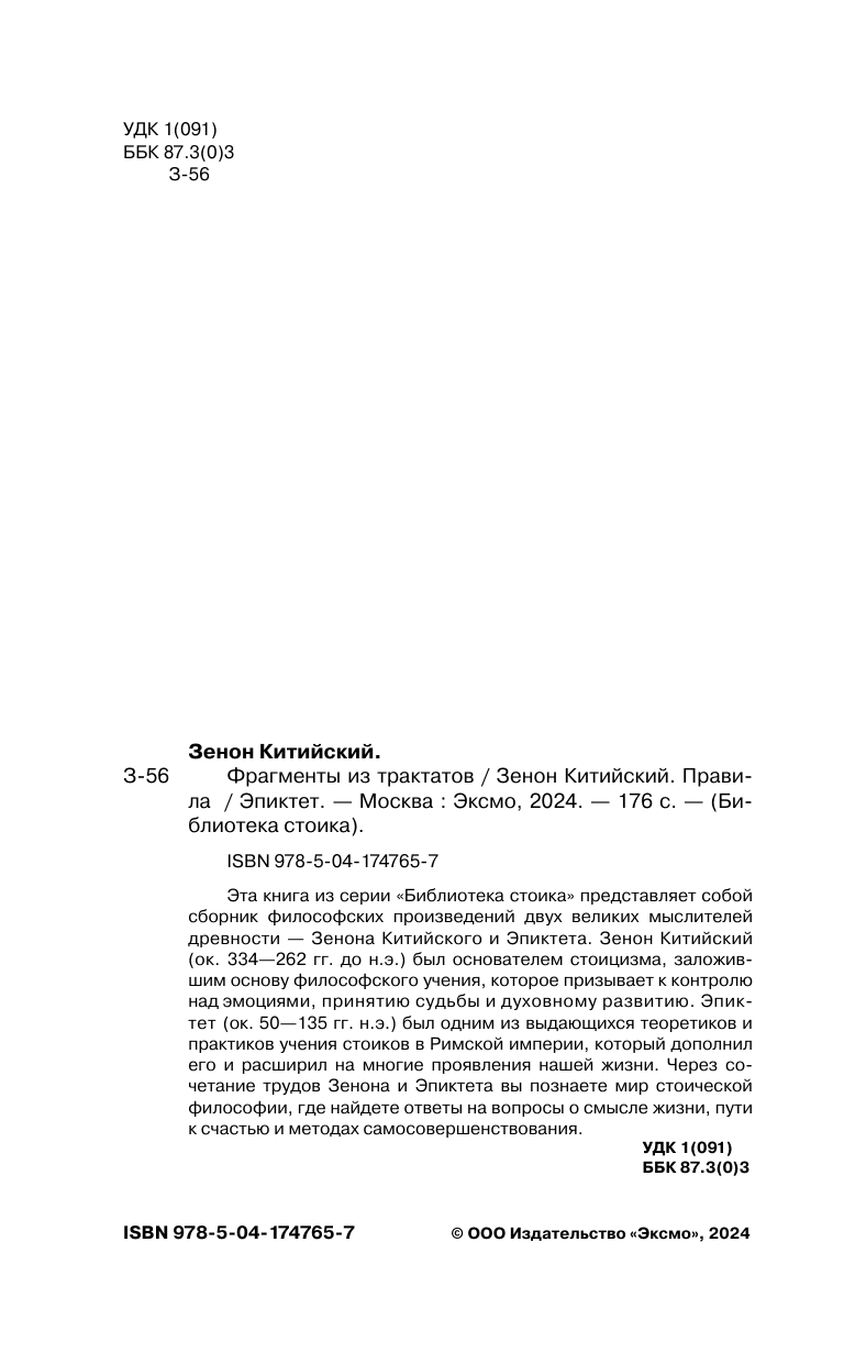 В ней вы найдете великие произведения, внесшие неоценимый вклад в развитие античной философской мысли: «Фрагменты из трактатов» Зенона Китийского и «Правила» Эпиктета. Эти труды дошли до нас сквозь многие века и, несмотря на это, не потеряли ни доли своей актуальности и сегодня. Приобщитесь к философии стоицизма, которая поможет вам научиться контролировать свои эмоции, принимать жизненные испытания с достоинством и найти путь к внутреннему спокойствию.