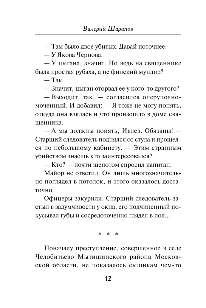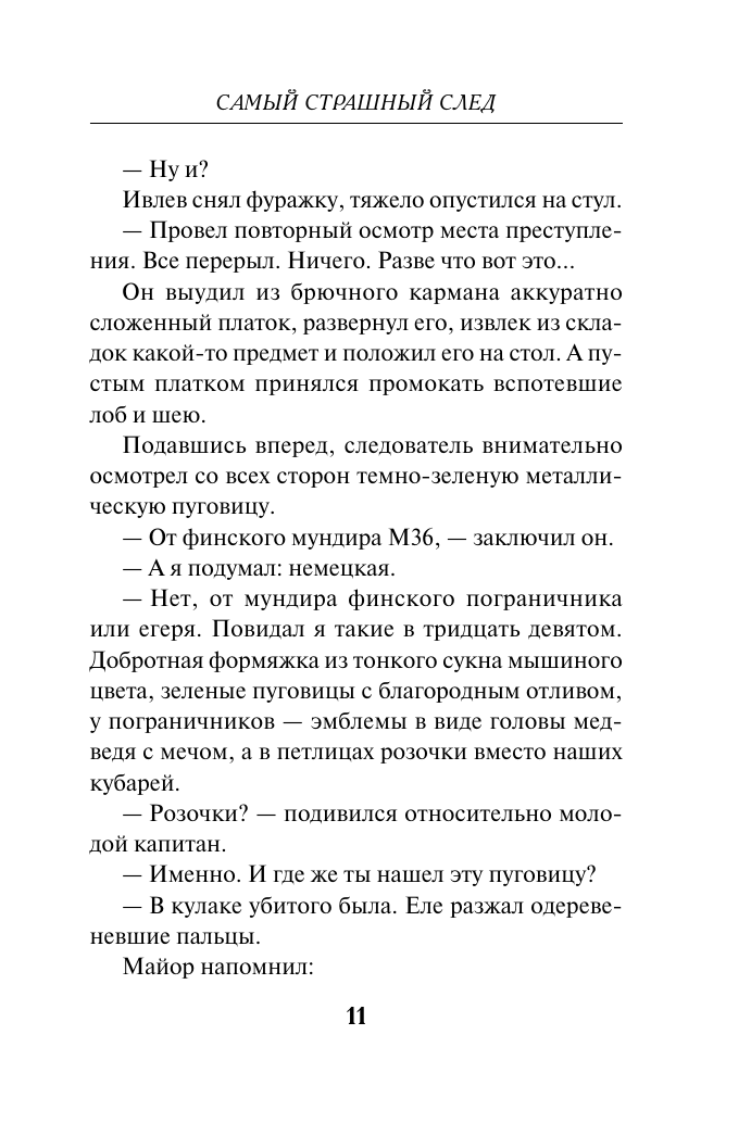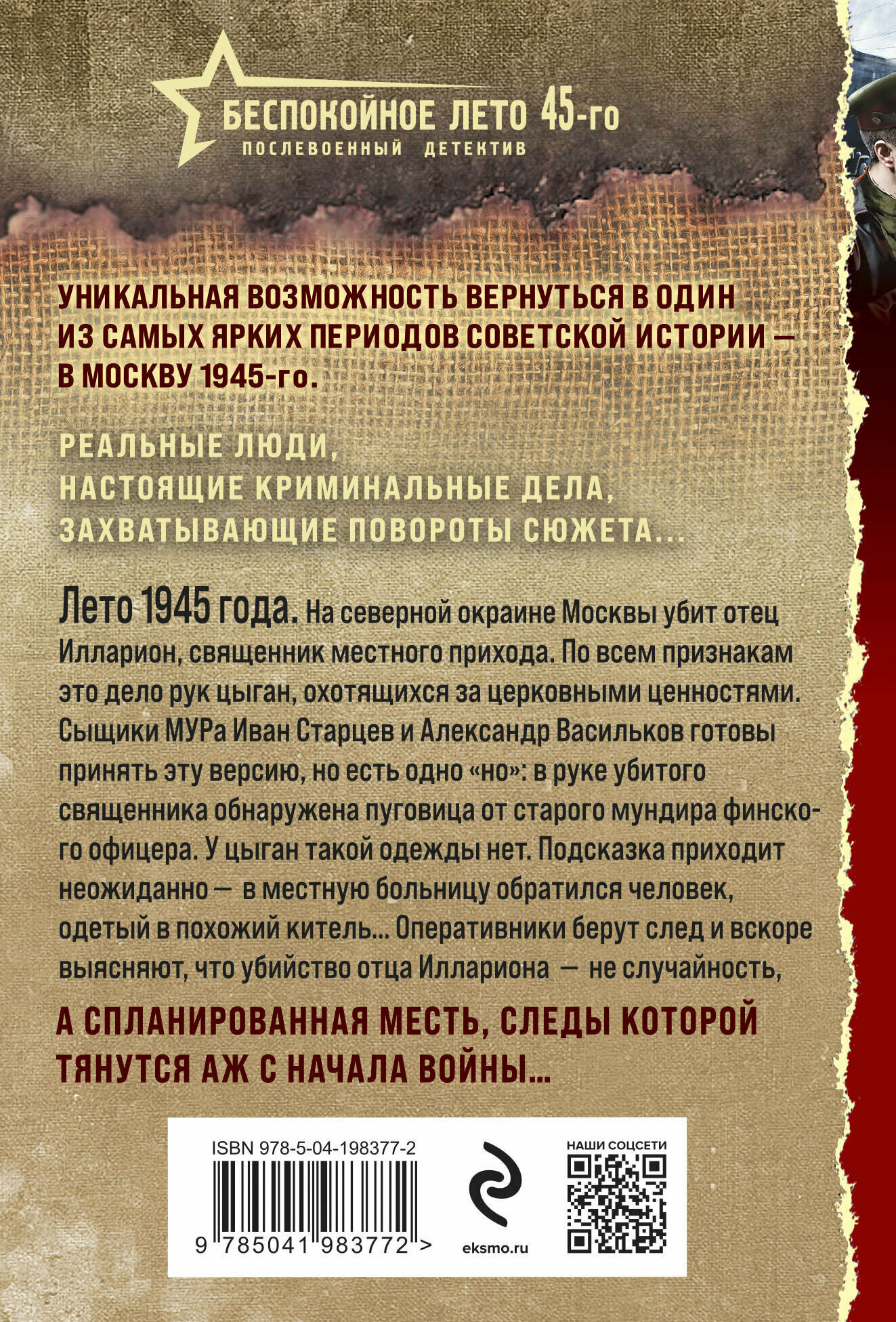 Лето 1945 года. На северной окраине Москвы убит отец Илларион, священник местного прихода. По всем признакам, это дело рук цыган, охотящихся за церковными ценностями. Сыщики МУРа Иван Старцев и Александр Васильков готовы принять эту версию, но есть одно «но»: в руке убитого священника обнаружена пуговица от старого мундира финского офицера. У цыган такой одежды нет. Подсказка приходит неожиданно — в местную больницу обратился человек, одетый в похожий китель… Оперативники берут след и вскоре выясняют, что убийство отца Иллариона — не случайность, а спланированная месть, следы которой тянутся аж к началу войны…
