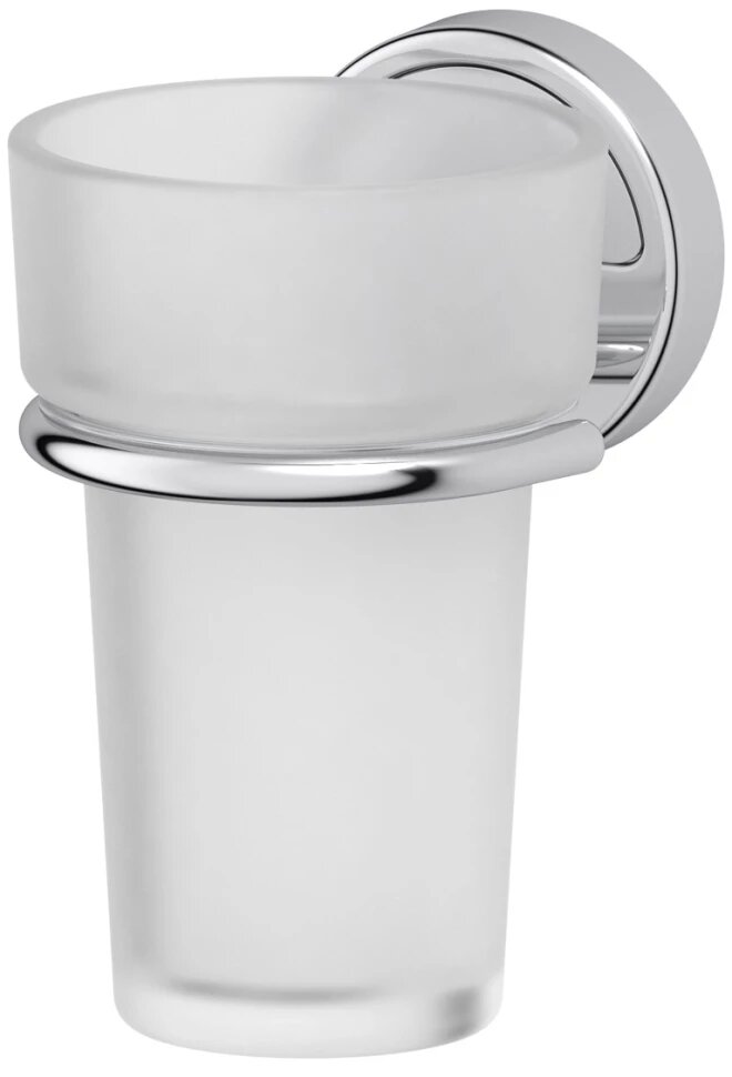 Удобный небольшой стаканчик из утолщенного матового стекла. Крепление стакана металлическое и выполнено из латуни с хромовым покрытием. Стакан легко мыть и чистить, металлические детали устойчивы к ржавчине. Высота изделия - 118 мм, диаметр стакана - 79 мм.