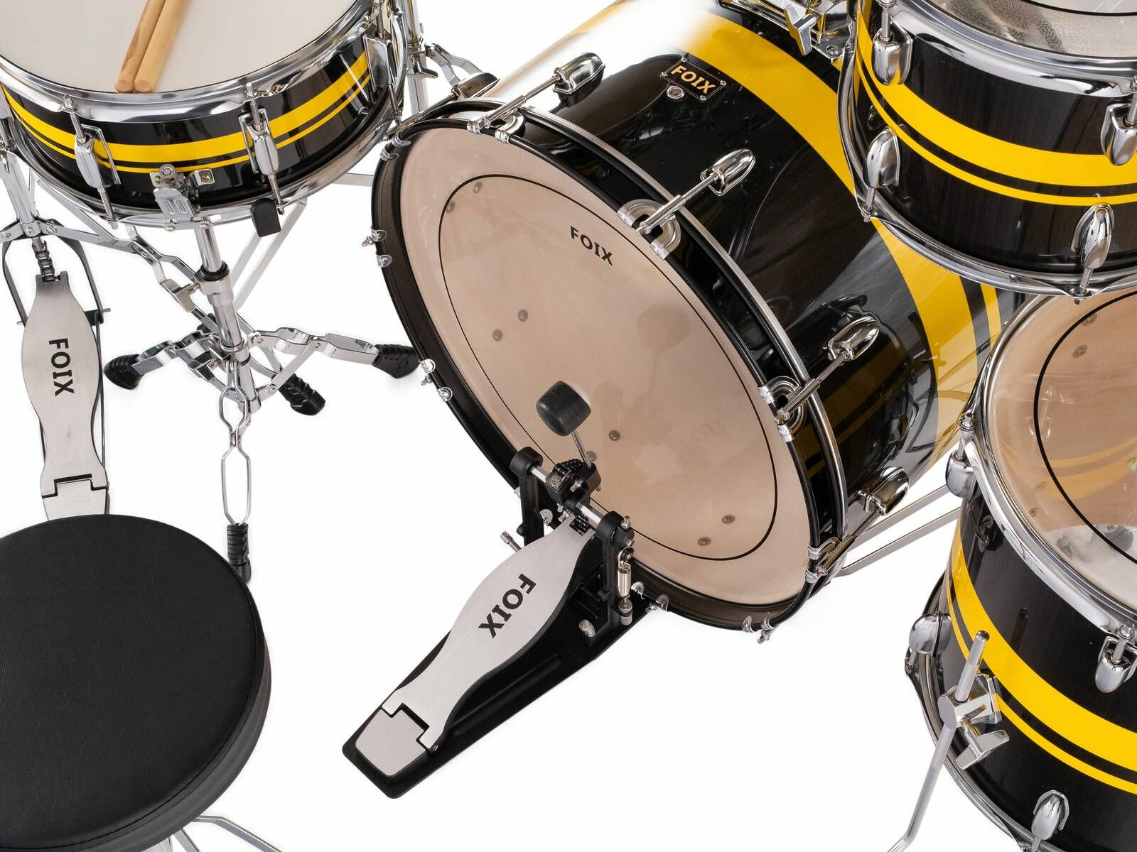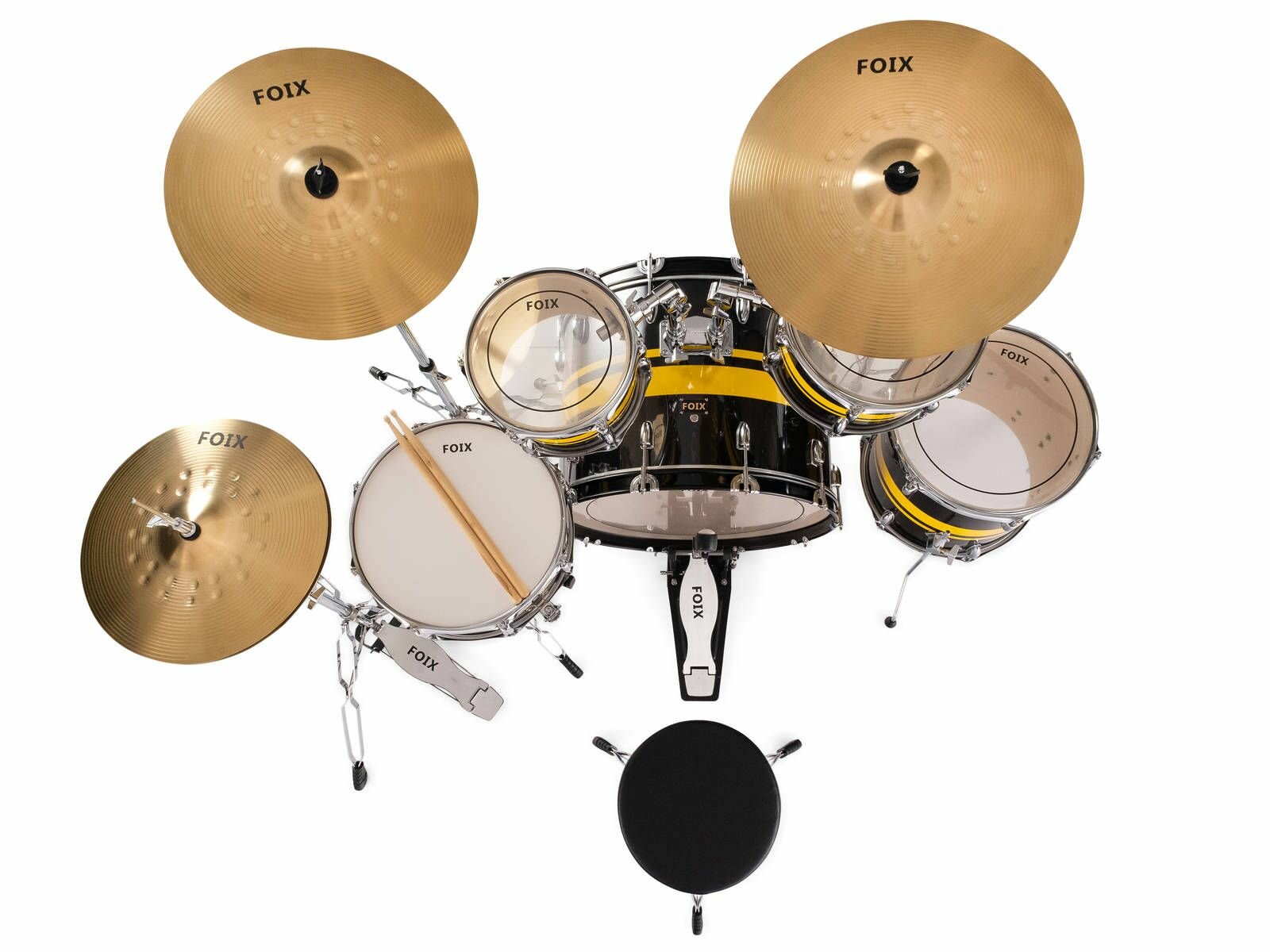 Foix Барабанная установка, черная/желтая, Foix Характеристики:Обечайки: тополь.Пластик бас-барабана с отверстием.Диаметр стоек: 22мм.Том барабан 10"x8".Том барабан 12"x9".Напольный том 14"x14".Бас-барабан 22"x16".Рабочий барабан 14" X 5.5"Комплект хардвера.Тарелки FOIX (толщина 1,2мм):Райд 18",Краш 16",Хай-хет 14" X2Стул.Палочки.Цвет: черный/желтый.