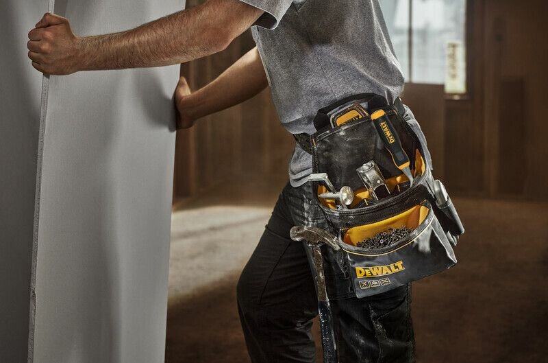 DEWALT DWST40101 Pro Сумка с различными карманами; чехол для рулетки, внешний держатель отвертки, защищенный карман для пилы и металлическая петля молотка. Его широкая открытая структура обеспечивает легкий доступ, в то время как внутренняя подкладка с высокой видимостью позволяет легко находить инструменты. Изготовлен из высококачественной ткани 1680D и грязеотталкивающей ткани брезента. С усиленной строчкой для повышения долговечности и удержания формы с течением времени. Прочный ремень имеет металлическую роликовую пряжку для улучшенного удержания. Также есть верхняя ручка для переноски, так что вы можете легко транспортировать ремень, когда он не используется. Размер ремня: 132 см.