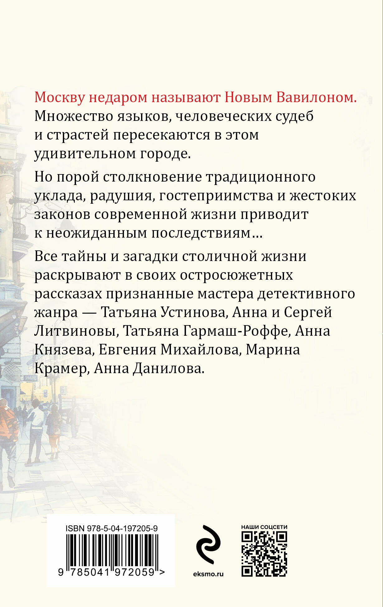 Москву недаром называют Новым Вавилоном. Множество языков, человеческих судеб и страстей пересекаются в этом удивительном городе. Но порой столкновение традиционного уклада, радушия, гостеприимства и жестоких законов современной жизни приводит к неожиданным последствиям. Все тайны и загадки столичной жизни раскрывают в своих остросюжетных рассказах признанные мастера детективного жанра - Татьяна Устинова, Анна и Сергей Литвиновы, Татьяна Гармаш-Роффе, Анна Князева, Евгения Михайлова, Марина Крамер, Анна Данилова.