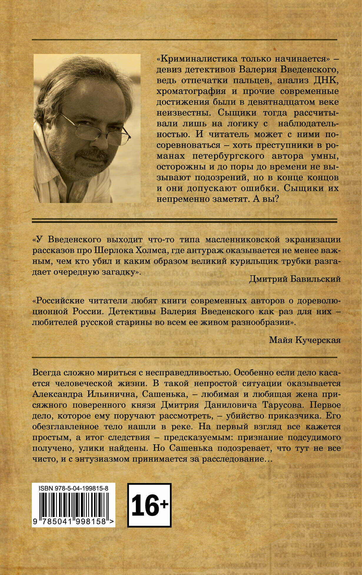 Всегда сложно мириться с несправедливостью. Особенно если дело касается человеческой жизни. В такой непростой ситуации оказывается Александра Ильинична, Сашенька, – любимая и любящая жена присяжного поверенного князя Дмитрия Даниловича Тарусова. Первое дело, которое ему поручают рассмотреть, — убийство приказчика. Его обезглавленное тело нашли в реке. На первый взгляд, все кажется простым, а итог следствия – предсказуемым: признание подсудимого получено, улики найдены. Но Сашенька подозревает, что тут не все "чисто", и с энтузиазмом принимается за расследование…