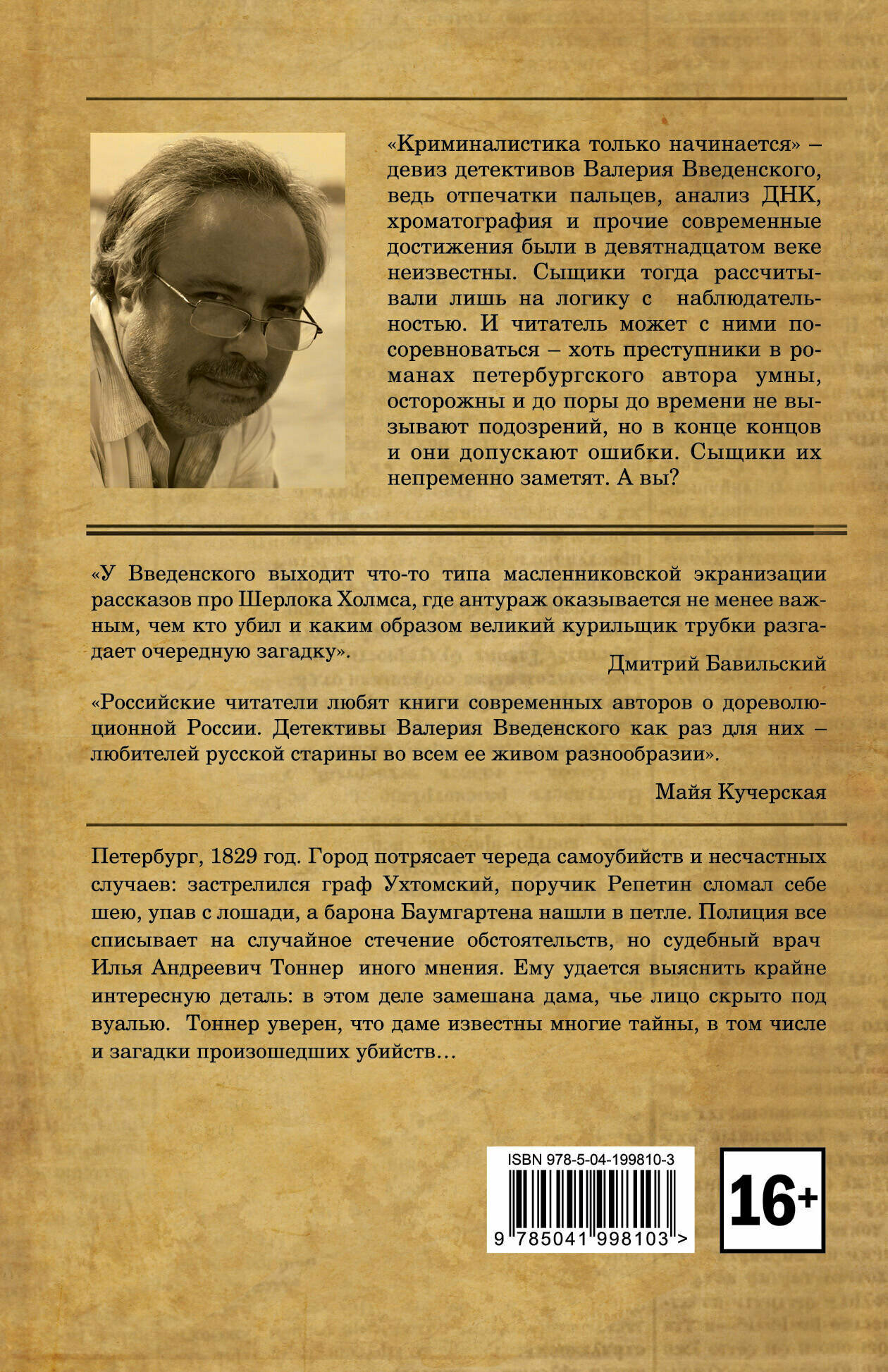 Петербург, 1829 год. Город потрясает череда самоубийств и несчастных случаев: застрелился граф Ухтомский, поручик Репетин сломал себе шею, упав с лошади, а барона Баумгартена нашли в петле. Полиция все списывает на случайное стечение обстоятельств, но судебный врач, Илья Андреевич Тоннер, иного мнения. Ему удается выяснить крайне интересную деталь: в этом деле замешана дама, чье лицо скрыто под вуалью. Тоннер уверен, что даме известны многие тайны, в том числе и загадки произошедших убийств…
